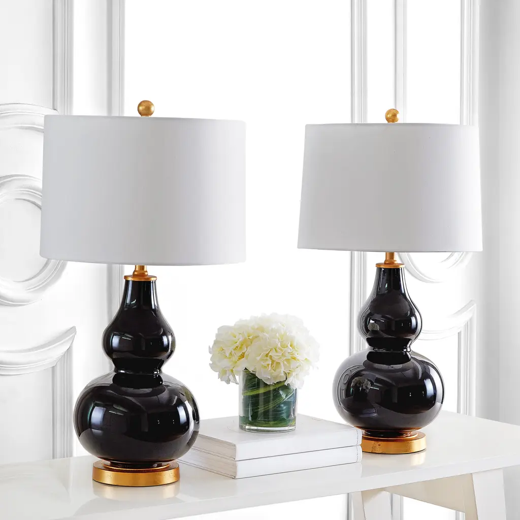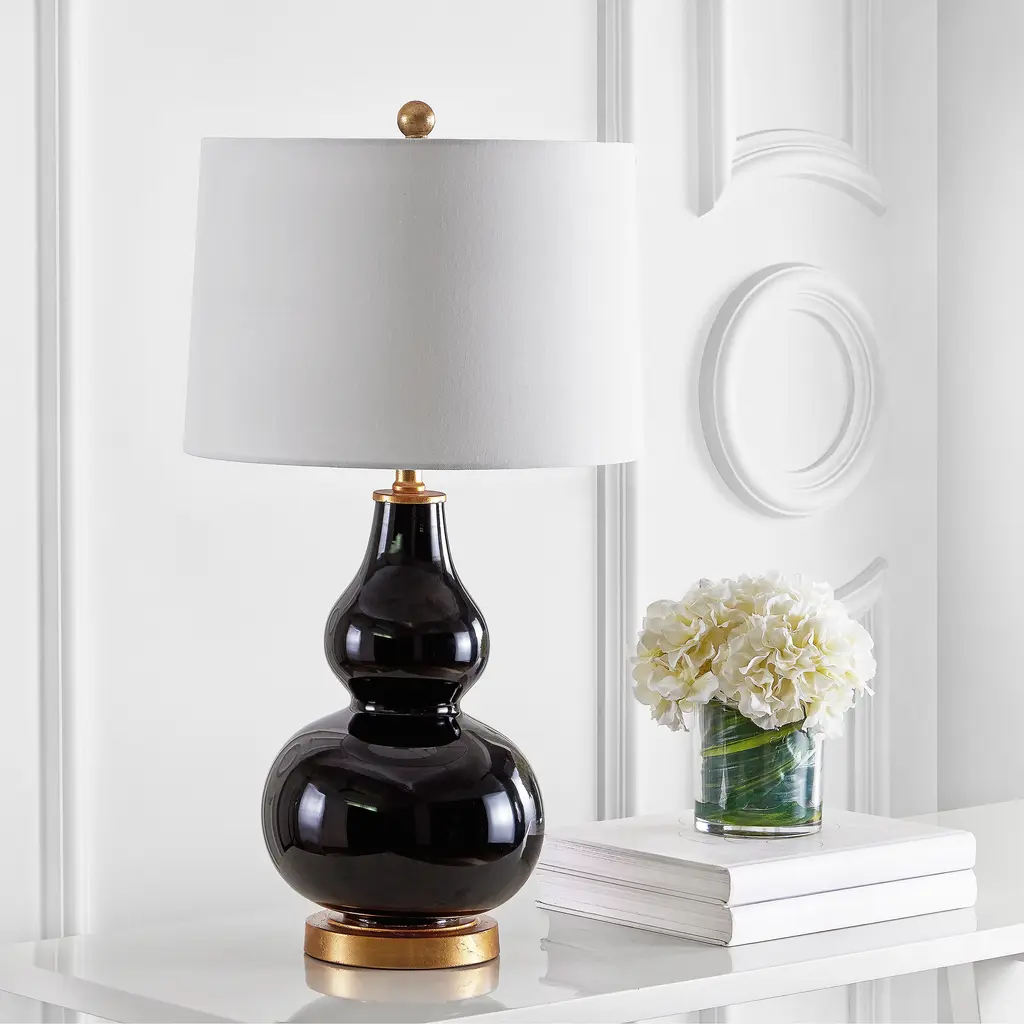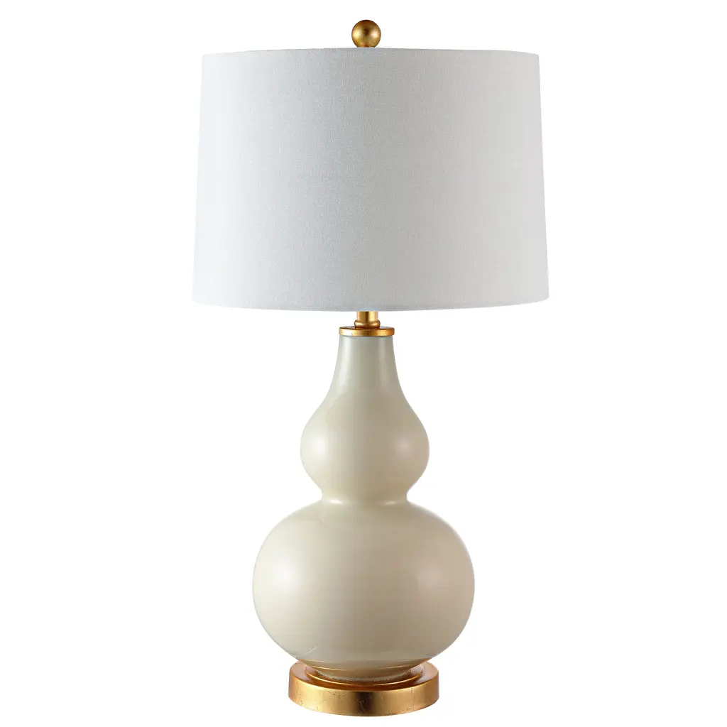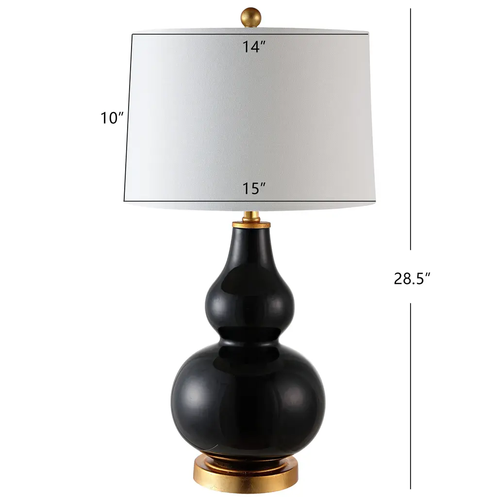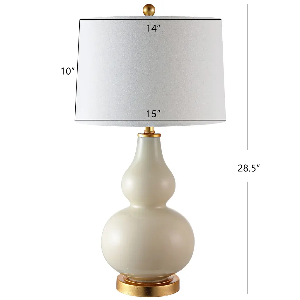 Illuminate your contemporary abode with the SAFAVIEH Lighting Karlen Gourd Table Lamp set. Flaunting gourd-shaped glass bases, complemented by gold wrought iron accents and white linen shades, these lamps offer a modern and stylish look. Available in black or cream, these lamps come with 2 LED bulbs, on/off rotary switches, and a set of 2 lamps. Measuring 28.5 inches high and 15 inches in diameter, they elevate your decor with their perfect dimensions.Features: