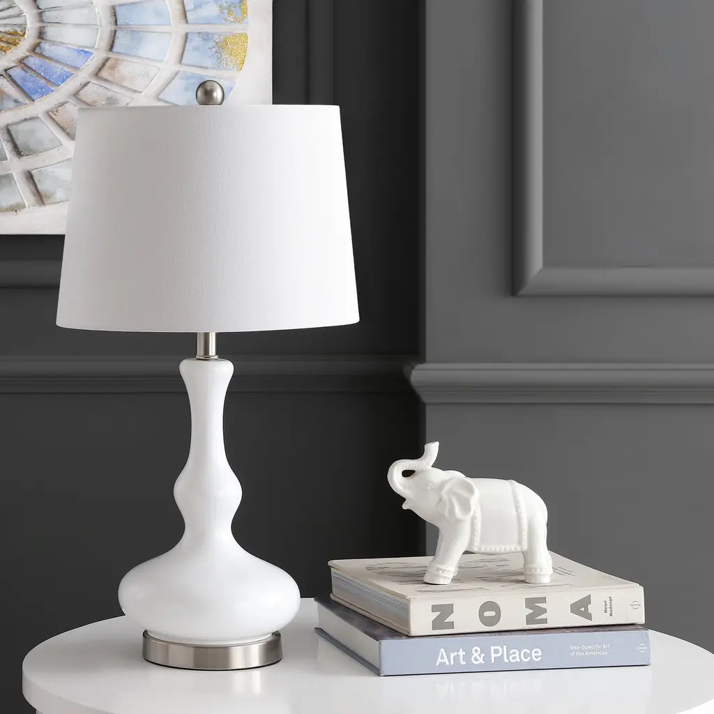 Make an artistic statement in any living room with this Kellen Table Lamp. Styled with sleek nickel finishes and an undulating white glass silhouette, Kellen's candlestick-inspired body is beautifully offset by the clean lines of its off-white cotton shade.