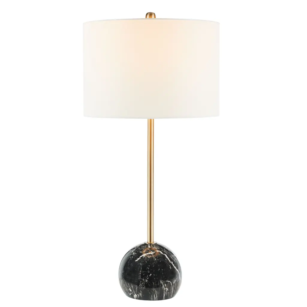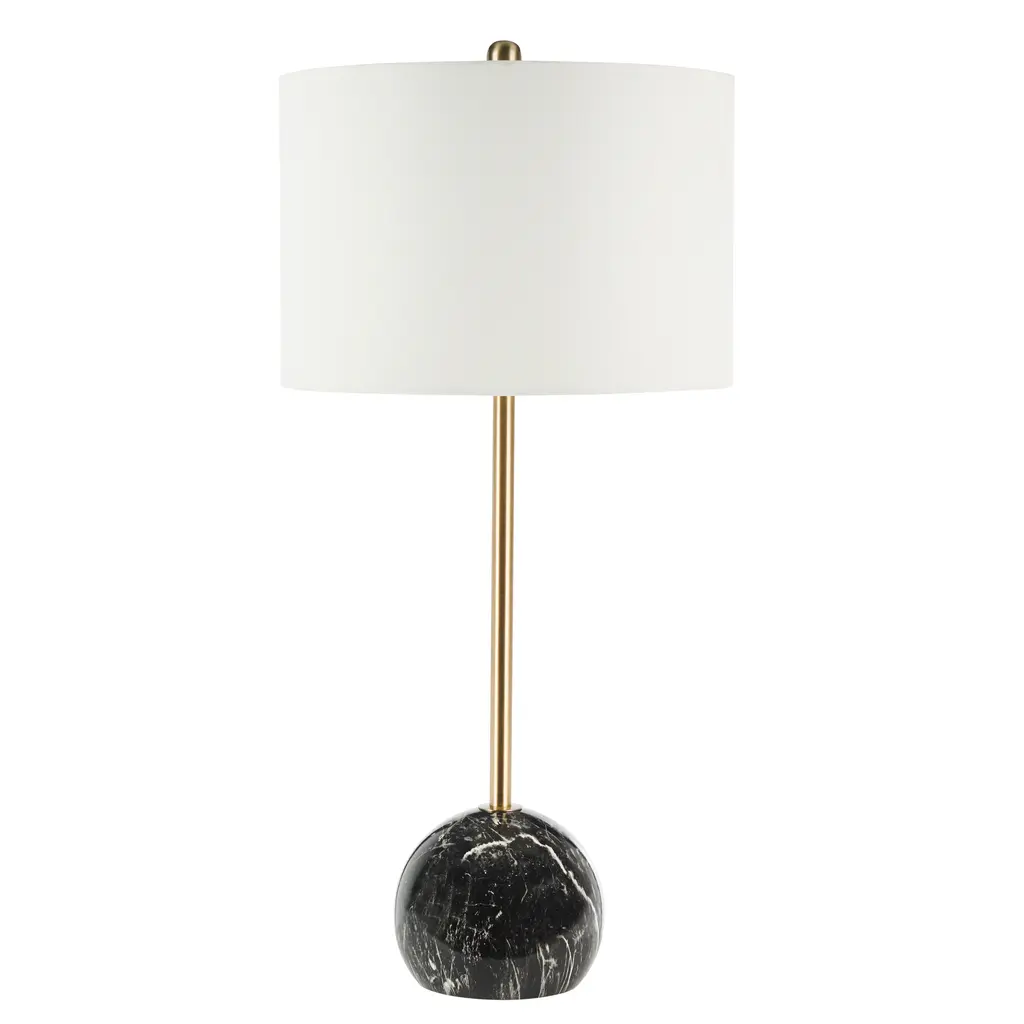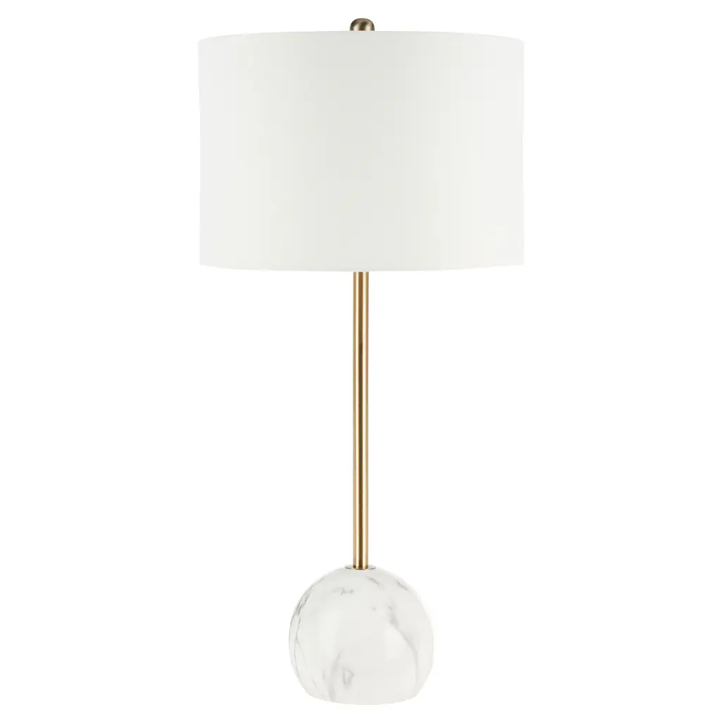 In a class of its own, this Kyrene Table Lamp is glamorously modern, making it perfect for today's contemporary interiors. Kyrene's spherical white marble base provides the perfect decorative counterpoint to its sleek gold body, while a crisp white drum shade completes the look.