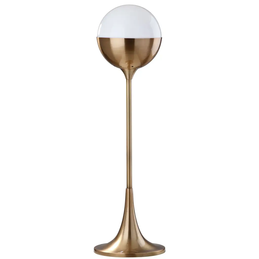 Embrace Mid-Century style with this 27-inch table lamp. A modern update of a vintage treasure, its bold brass and gold finish is paired with a white globe shade for soft illumination. Designers use it in pairs to frame a living room sofa, sideboard or console. Bulb Wattage: 9W Lighting Type: Table Lamp Number of Lights: 1 Light Lamp Type: Table Lamp Material: Metal Lighting Style: Contemporary Color: White, Gold