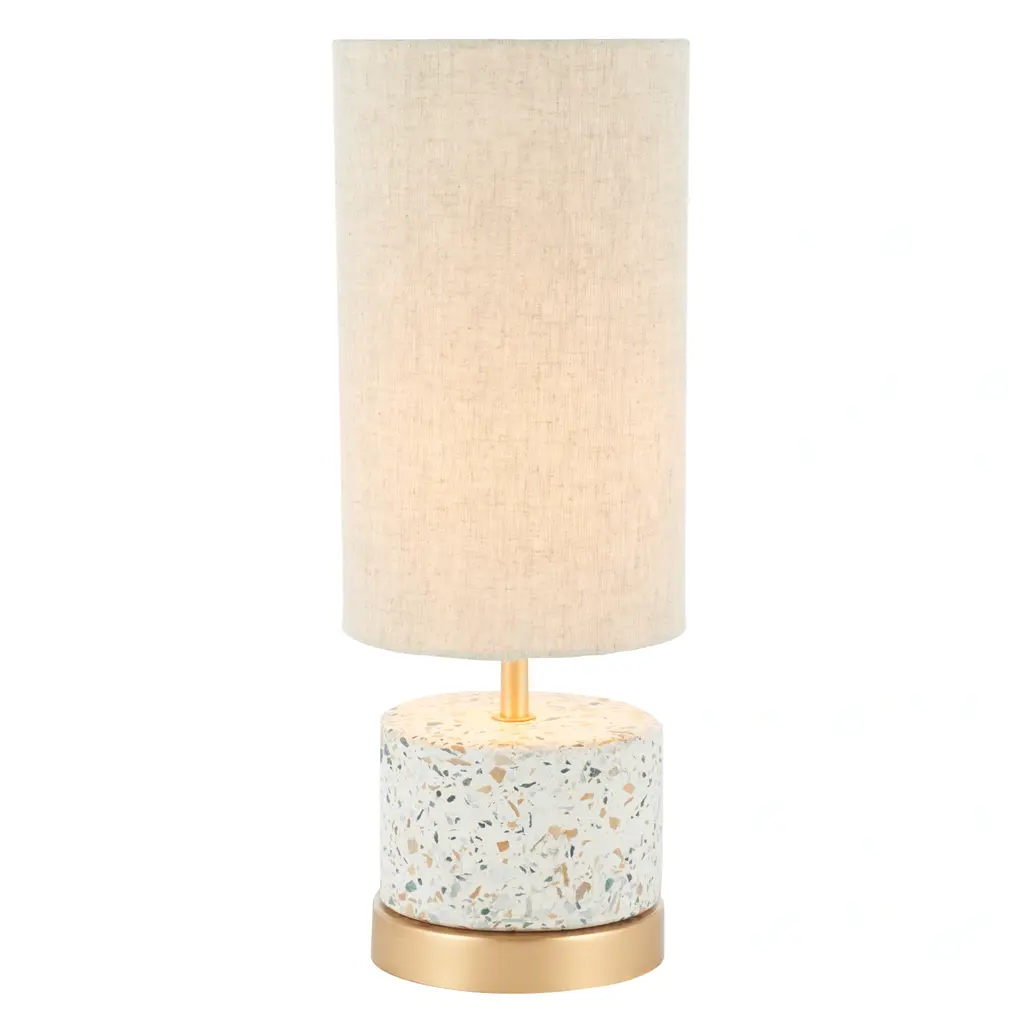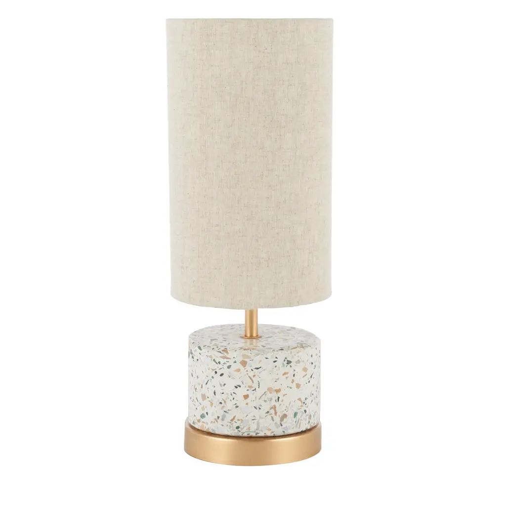 Add a playful and charming accent to your home with the Laszlo table lamp. A concrete composite is speckled with stone fragments to enrich the sleek cylindrical body of our table lamp. It features a tall and elegant drum shade to vouch for a delightful play of proportions. Lively and charming, the table lamp is completed with a complementing linen shade and gold accents to add personality and drama to your home.