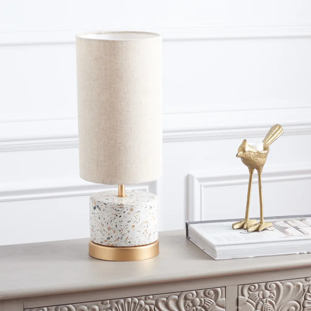 Add a playful and charming accent to your home with the Laszlo table lamp. A concrete composite is speckled with stone fragments to enrich the sleek cylindrical body of our table lamp. It features a tall and elegant drum shade to vouch for a delightful play of proportions. Lively and charming, the table lamp is completed with a complementing linen shade and gold accents to add personality and drama to your home.