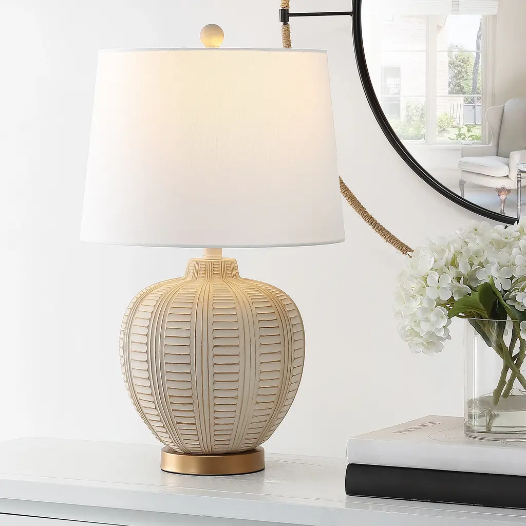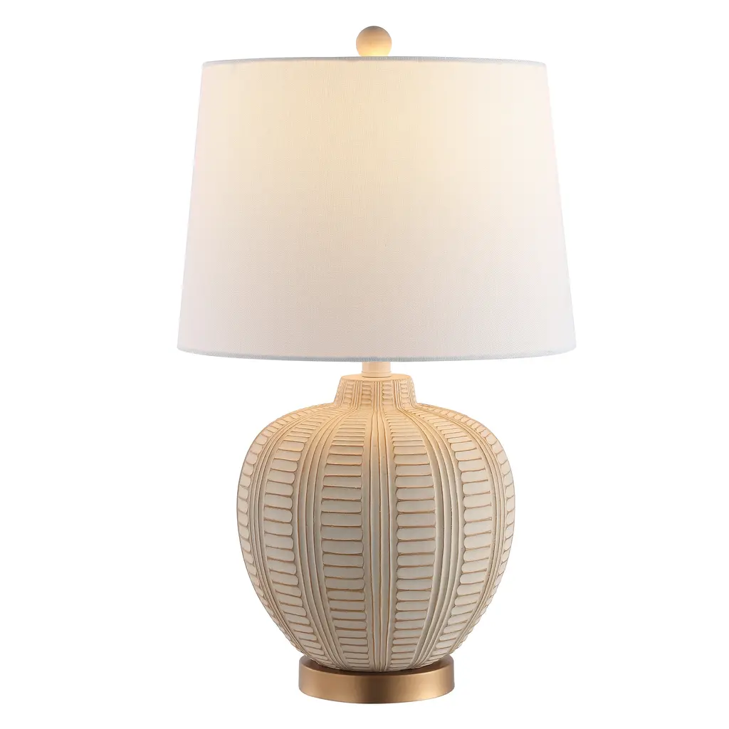 Enrich your décor with the poetic appeal of this Marrla Table Lamp. Flaunting textured bands of alternating horizontal and vertical details, Marrla's sleek rose gold base elevates the aesthetic elegance of its textured cream resin body, perfectly balanced by a tapered drum shade. Designers love its built-in USB port.