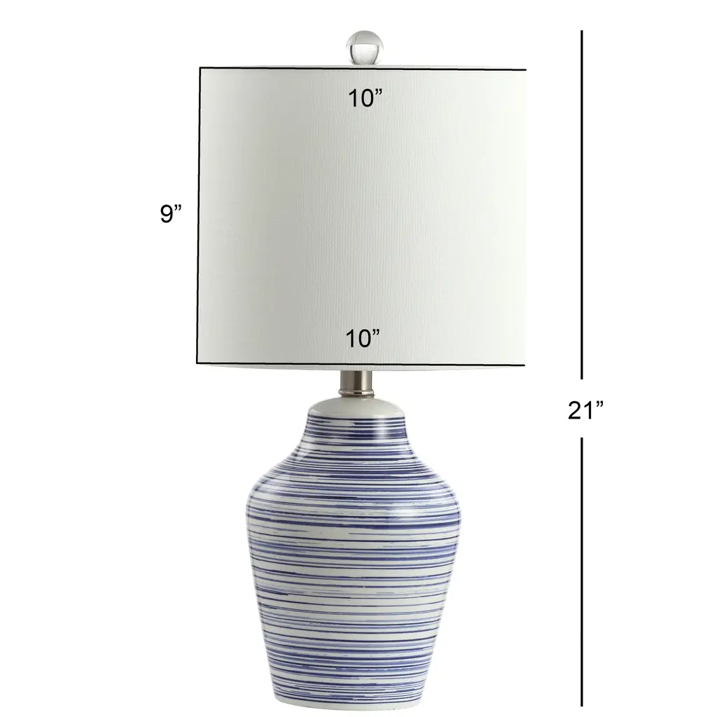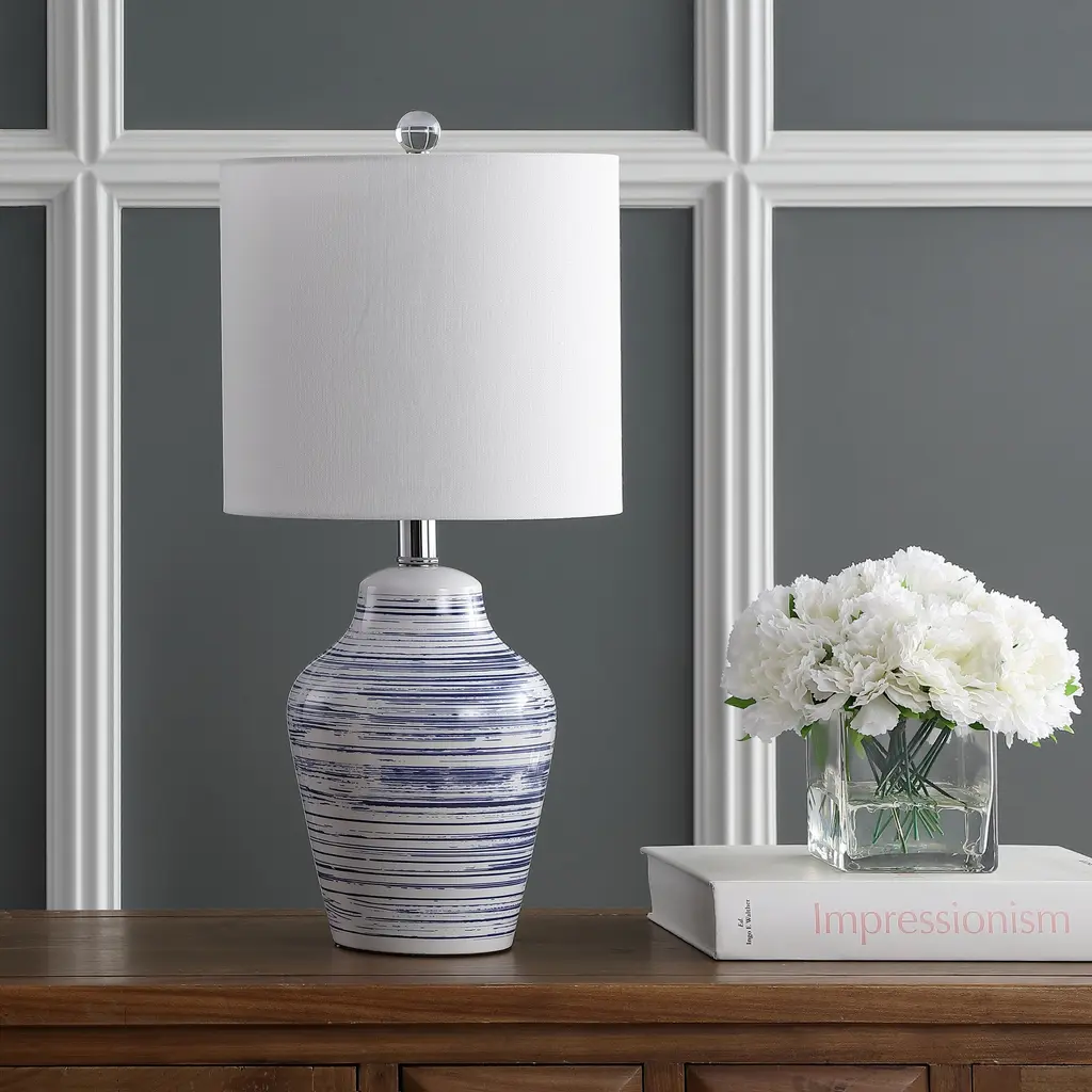 This Maxton Table Lamp elevates any room with graceful curves and artistic striations. Finely crafted of ceramic, Maxton's white and blue hues are perfectly paired with chrome hardware and off-white cotton shade. Sold in sets of two.