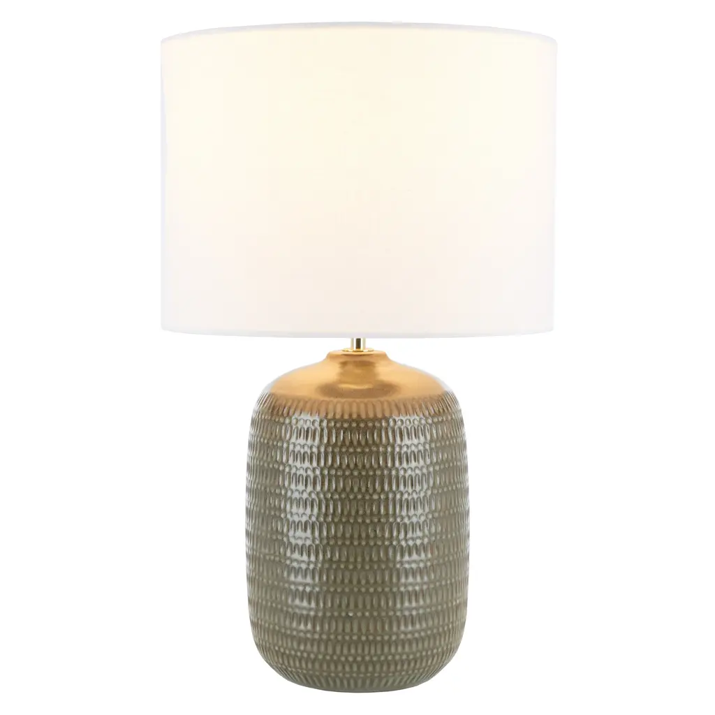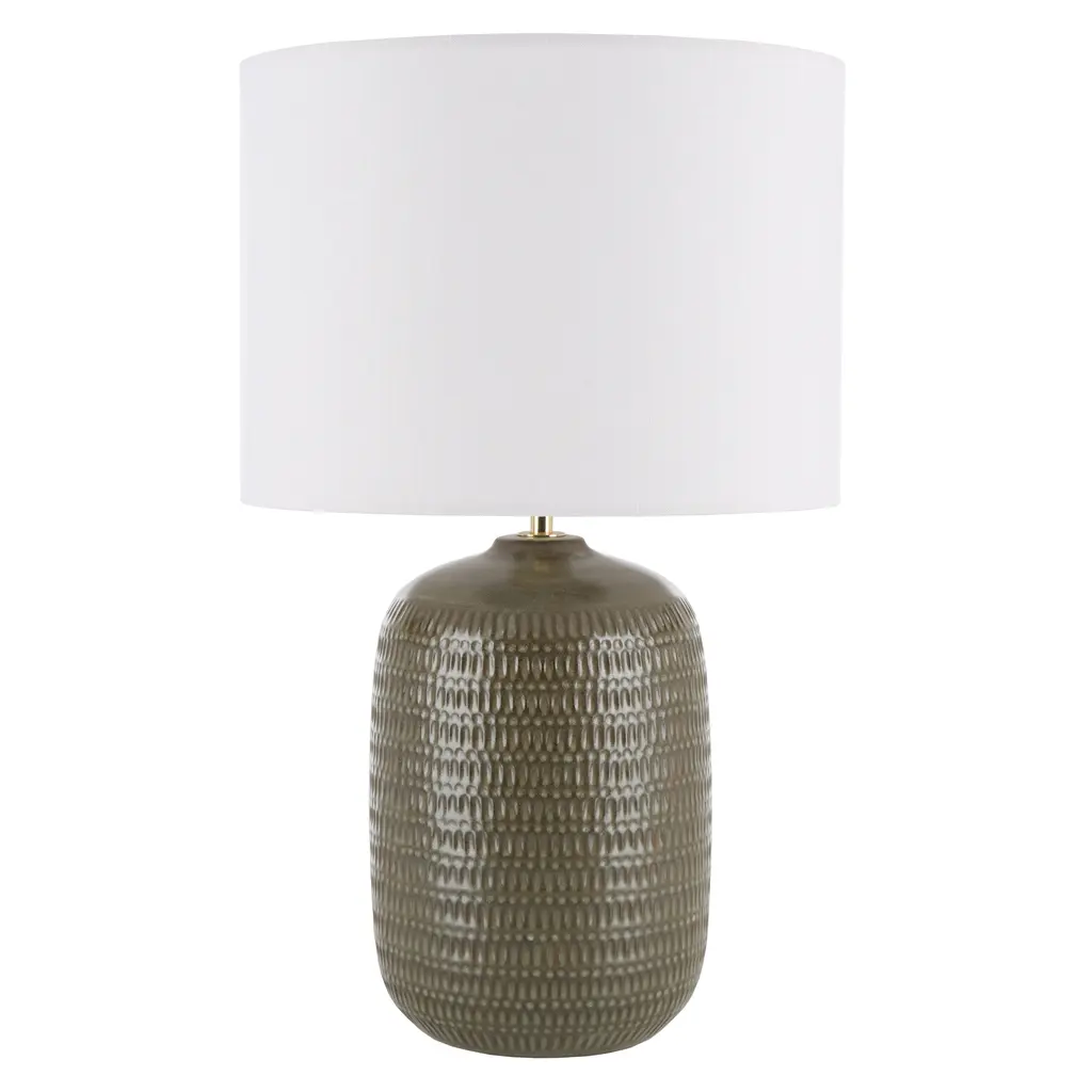 Bring a modern and artsy flair to your home with our Oryn ceramic table lamp. Its elegant ceramic body is defined by soft, curved edges. Enriched in taupe distressed glaze, the table lamp showcases an artistic texture and color variation, adding a dose of visual interest to your tabletop. It is finished off with a contrasting off-white drum shade that filters light for a pleasant and comforting glow.
