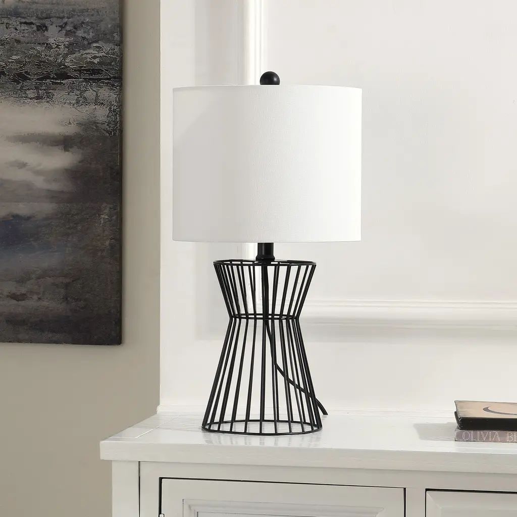 Bring sleek style and charm to your tabletop with our Rayna table lamp. Our modern table lamp maintains a chic, industrial edge with a cage-style base. With a sleek and geometric profile, the lamp vouches for a stately and airy presence, sitting easy and gracefully on any tabletop. It is completed with a white drum shade to lend an eye-catching accent and softly diffused glow to your nightstand, console, or side table.