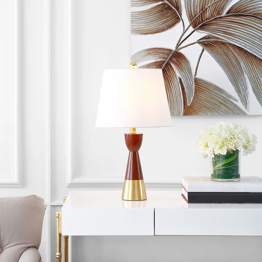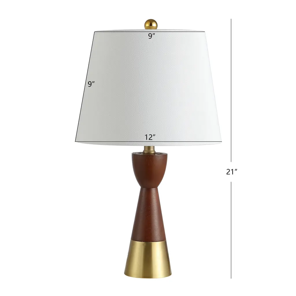 A more geometric interpretation of the classic hourglass figure, this Renni Table Lamp is designed to bring warm elegance to any décor. Renni's rich brown body and brass gold accents are softened by a white linen shade, its subtle angles adding to Renni's sense of motion.