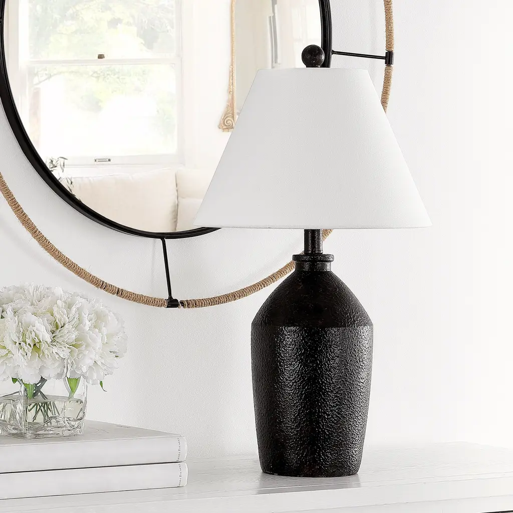 Styled after ancient pottery from the cradle of civilization, this Selna Table Lamp brings a collector's charm to any room. Selna's organic textural intrigue is beautifully offset by the crisp lines of its white empire shade, its deep brown tone emanating a warm, rich feel.