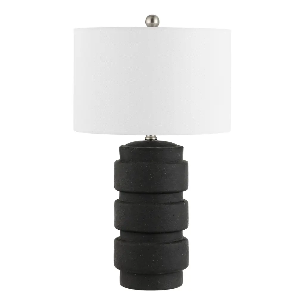Embrace an irresistibly chic and stylish accent with our Sero table lamp. Cylindrical discs are stacked to attain a sleek and eye-catching base. The bold silhouette and refined details of our table lamp are accentuated with a contrasting black finish and a sleek white drum shade. Lending modern appeal to any corner, our table lamp softly illuminates your console, side table, or nightstand.
