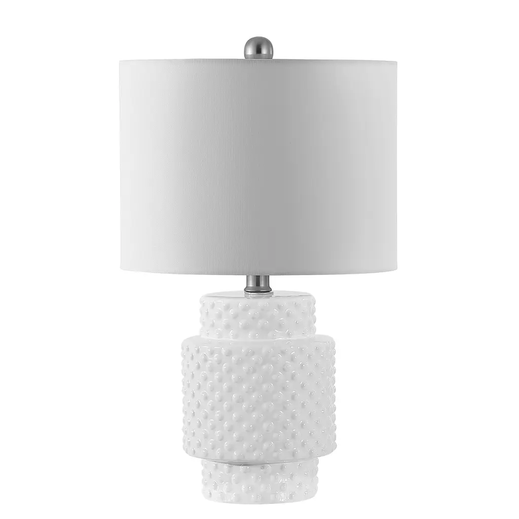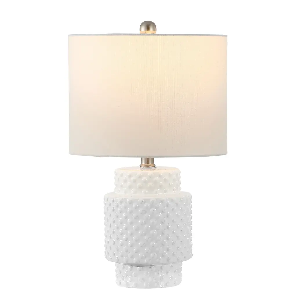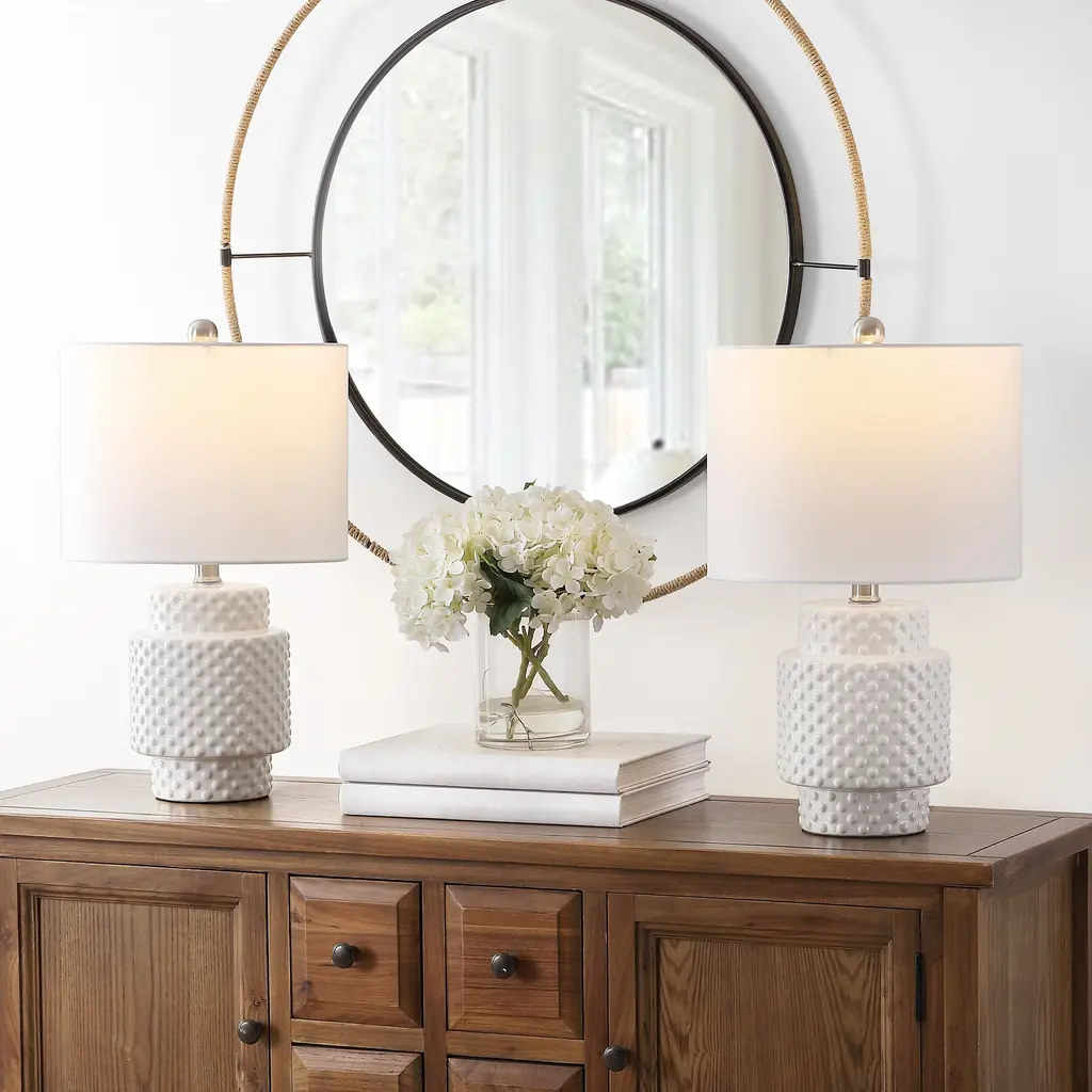 Illuminate your décor with the dramatic whimsy of this Sonter Table Lamp Sonter flaunts a geometric inverted hourglass profile in clean white poly-resin that provides the perfect canvas for its playful array of raised dots, giving any interior eye-catching appeal Sold in sets of two