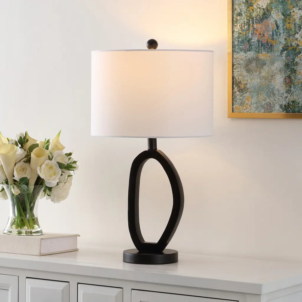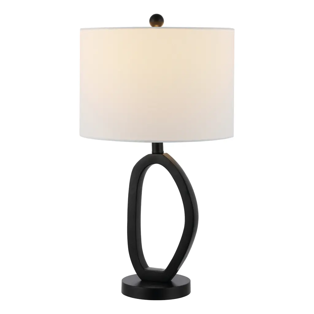 Uplift any bare surface with the sophisticated drama of our Verne table lamp. The sleek and graceful appeal of our table lamp is accentuated with a cut-out silhouette. It combines a stunning sculptural profile with a functional design to bring effortless style and drama to your home. Completed with a modern drum shade and a contrasting black body, the table lamp adds a stunning impact to a nightstand, side table, or dresser. When lit, the lamp diffuses soft light to amp up the mood and lighting of any corner.