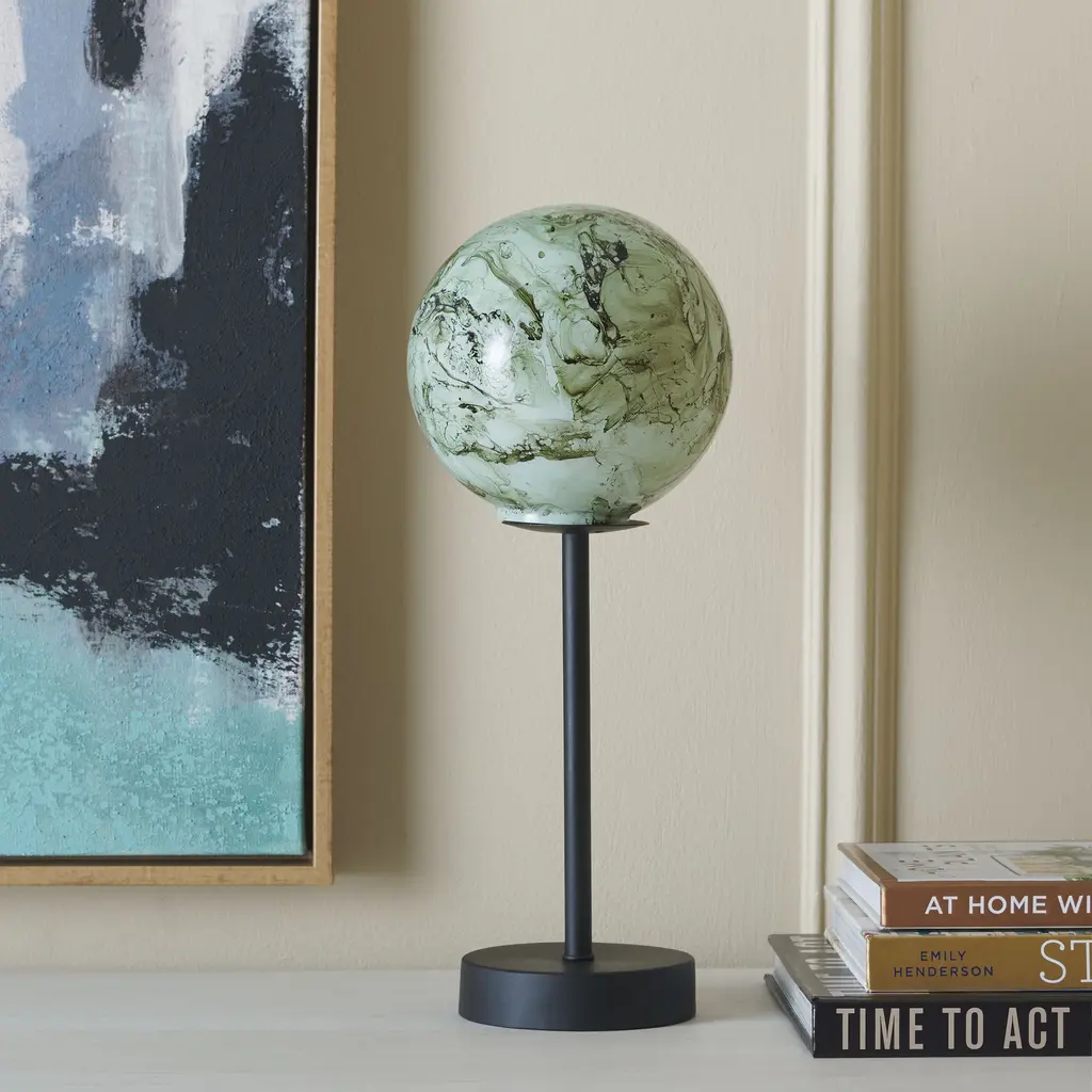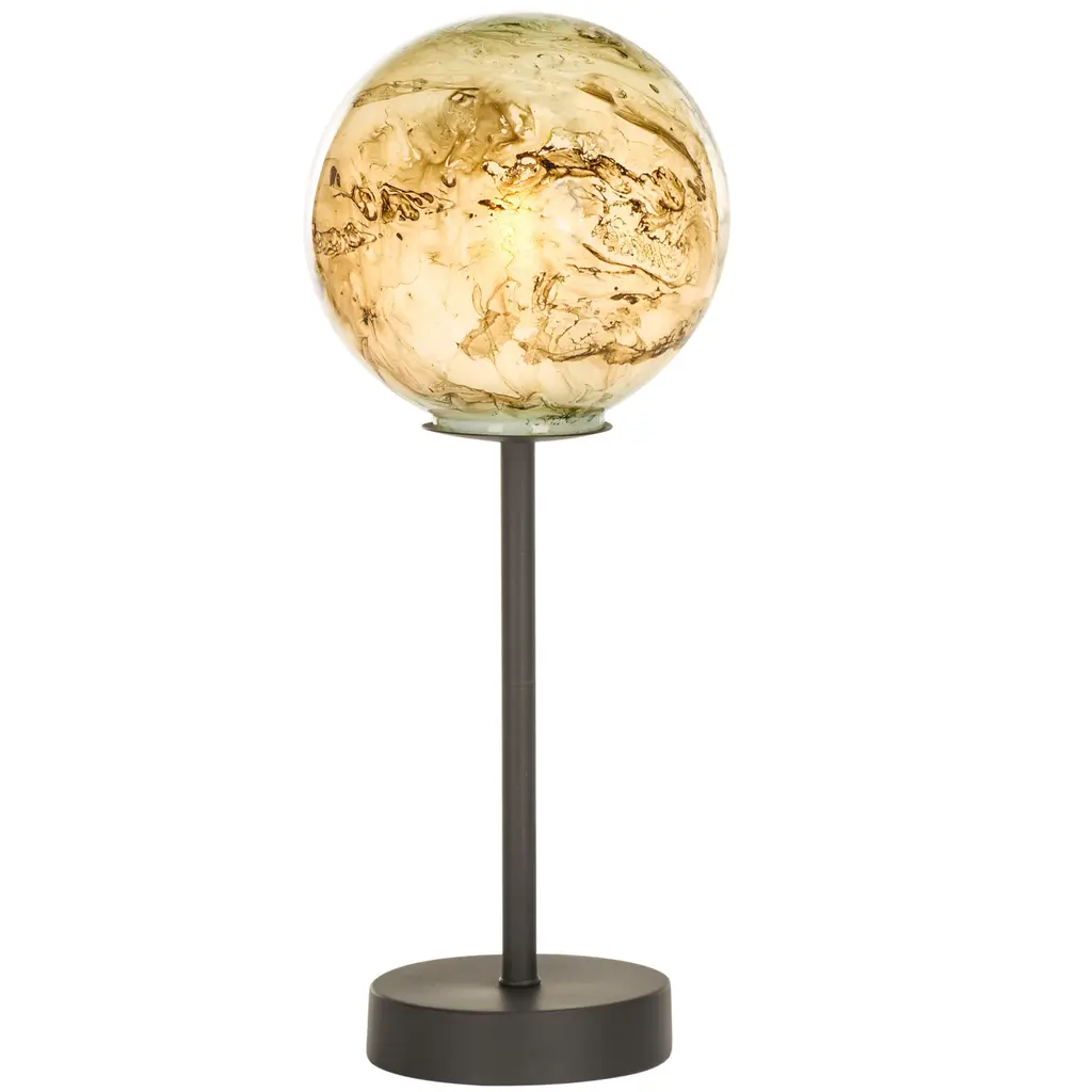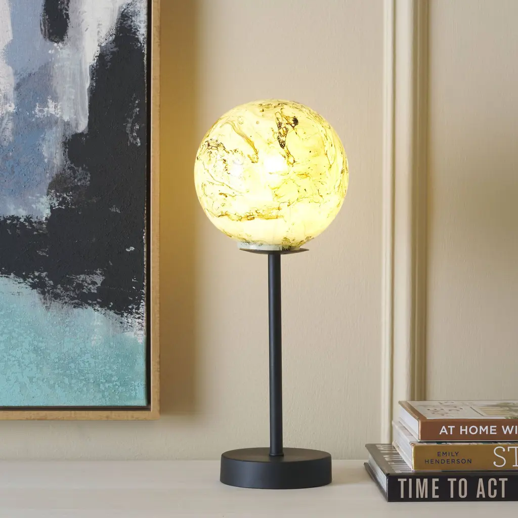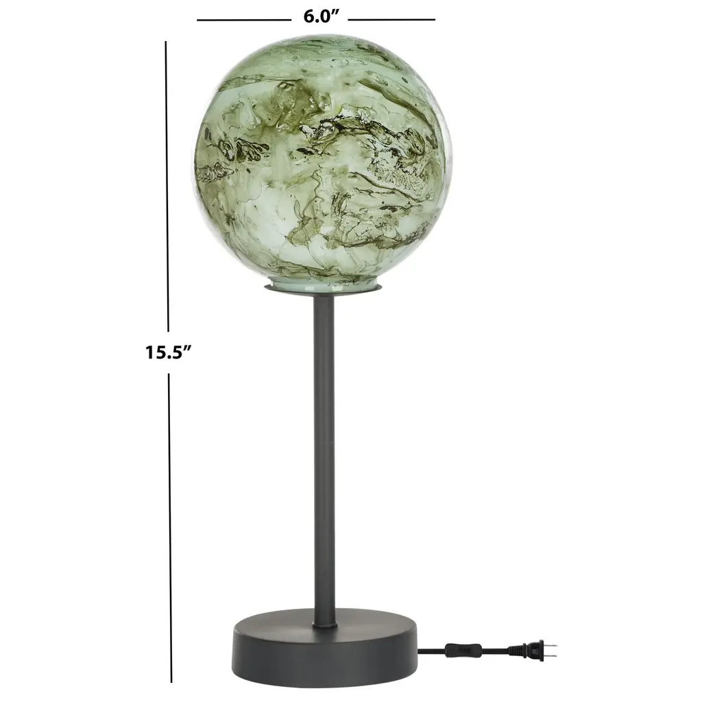 Illuminate your space with the stylish Zadie Table Lamp, a stunning piece that combines a sleek metal body with an eye-catching glass shade. Artfully crafted, the lamp features a base that provides a contemporary foundation. Above it, the spherical glass shade offers a captivating visual effect with its swirling patterns and variations in color that are sure to add a dash of artistic flair to any room. More than just functional lighting, this lamp acts as a statement piece that can bring together the look and feel of your interior. Embrace the sophistication and artistry of the Zadie Table Lamp, a perfect blend of form and function for any contemporary home.