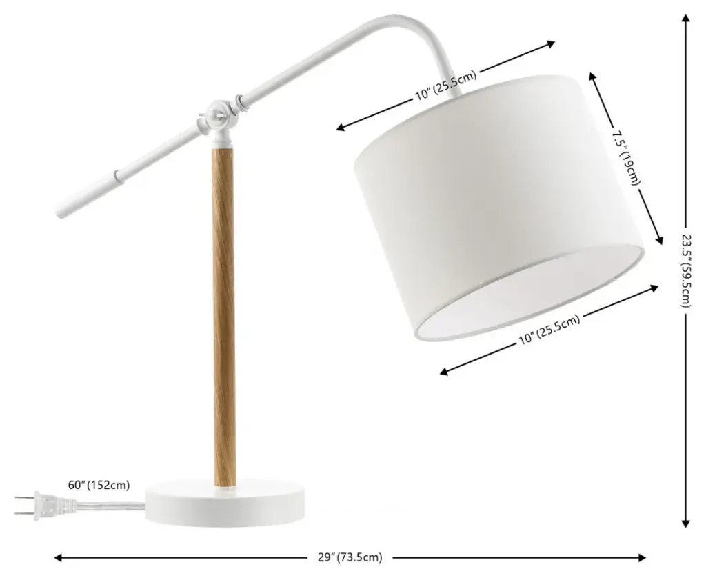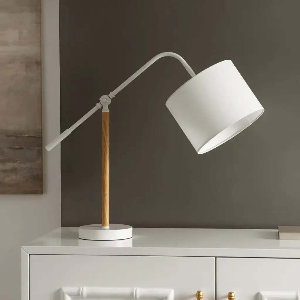 Update any surface with the modern charm and practicality of our Loryn table lamp. With clean lines and a graceful appeal, our table lamp remains a chic and inviting feature for any room. An elegantly curved arm suspends our modern drum shade. An overall white finish and warm wooden accents lend a fresh appeal to the table lamp. Its pivoting arm helps to direct light to your desired area. Our table lamp brightens up a desk, nightstand, or end table with effortless charm.