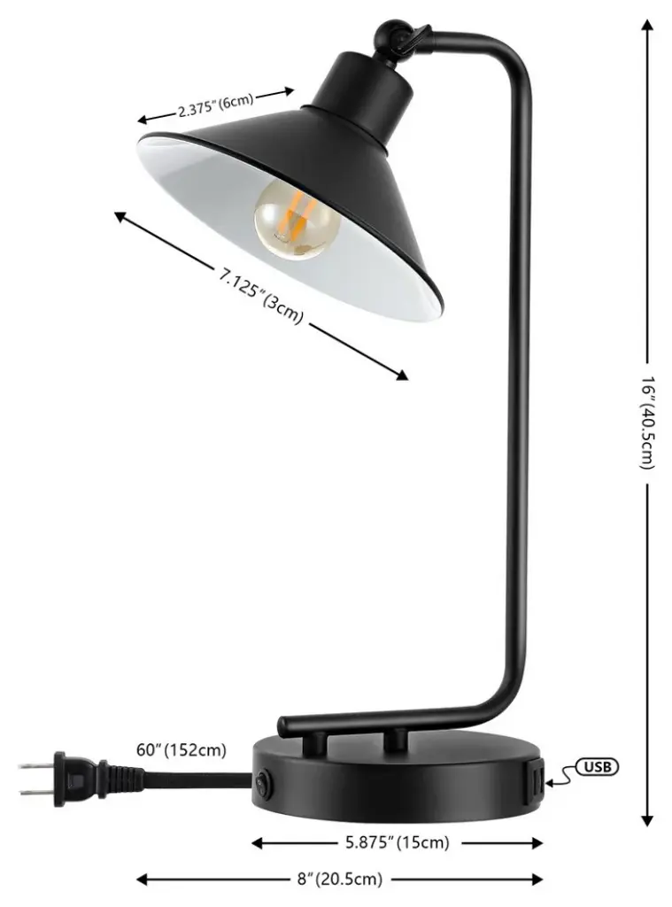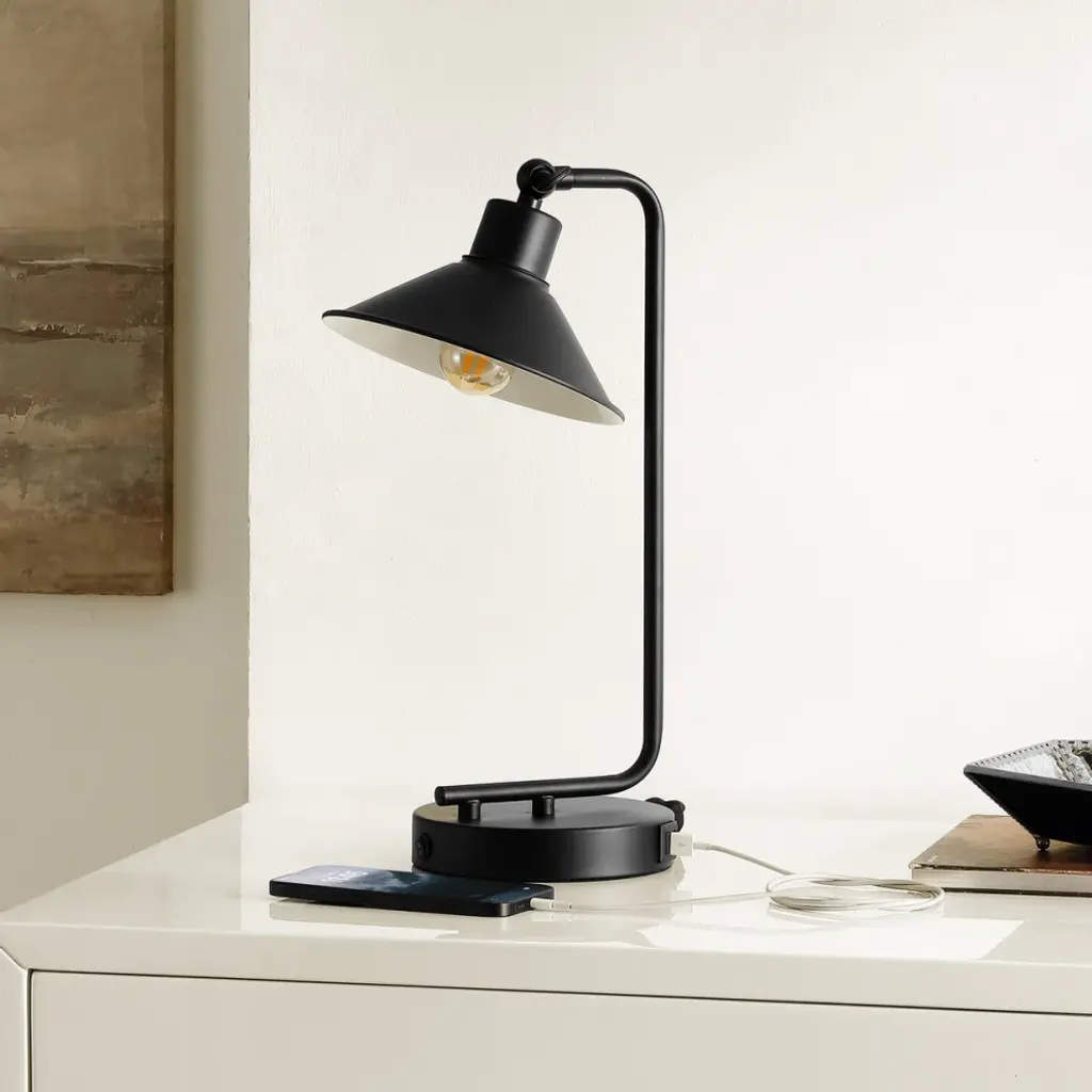 Illuminate your space with the sleek and chic presence of our Nadav table lamp. Our streamlined lamp elevates any corner with its sophisticated, mid-century appeal. The slender arm and flared cone shade accentuate the chic presence of the lamp. Its pivoting metallic shade helps in directing a warm and pleasant glow to your desired area. Showcasing a black metallic finish, our table lamp offers sleek style and a dose of functionality to your reading nook, bedside, or home office. It includes a USB port to keep your devices charged and ready.