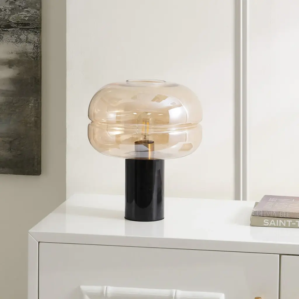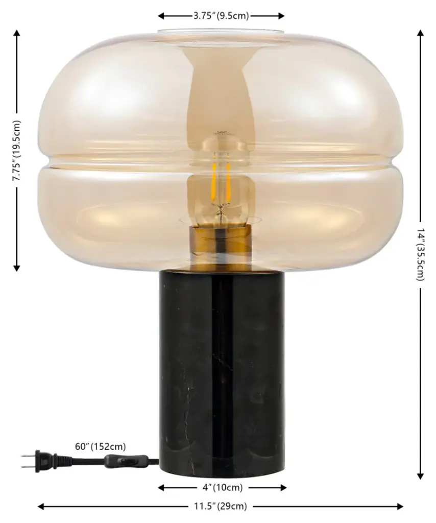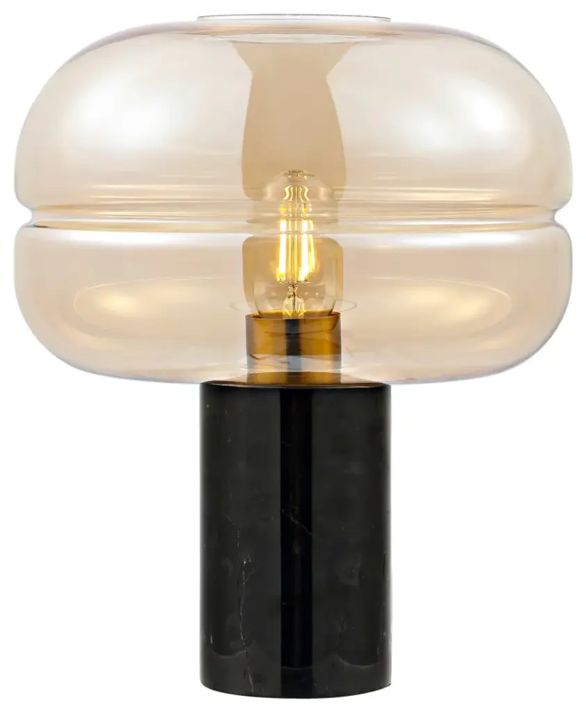 Strike a visual impact with our radiant and stylish Runa table lamp. Showcasing a striking glass shade and mix-material elegance, our table lamp offers stylish impact in any corner. The glass shade features swelled, eye-catching proportions and hand-blown appearance to make a striking statement. It is elevated upon a clean-lined black marble base to add a glamorous and polished touch to any corner. Our style-forward lamp features an amber glass shade to lend a warm and radiant light anywhere in your bedroom, lounge, or home office.
