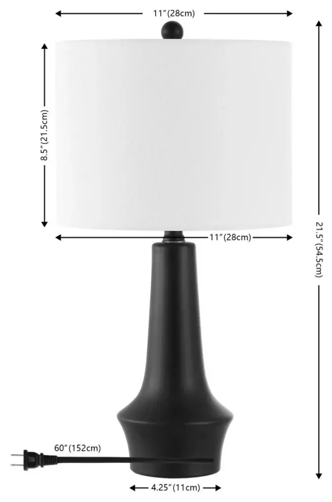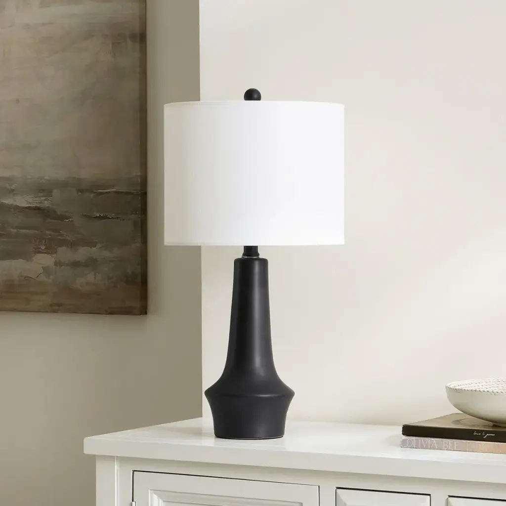 Bring modern charm to your tabletop with our Solyn table lamp. Boasting crisp lines and sleek curves, our table lamp vouches for a modern and chic presence. It features a tall and slender body to serve as a sophisticated and effortless addition to your modern home. Featuring a black ceramic body and a white drum shade, our table lamp strikes an impact with its high-contrasting finish. It diffuses a soft and warm glow to illuminate your desk, console, or nightstand in style.