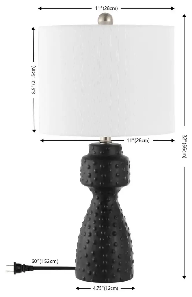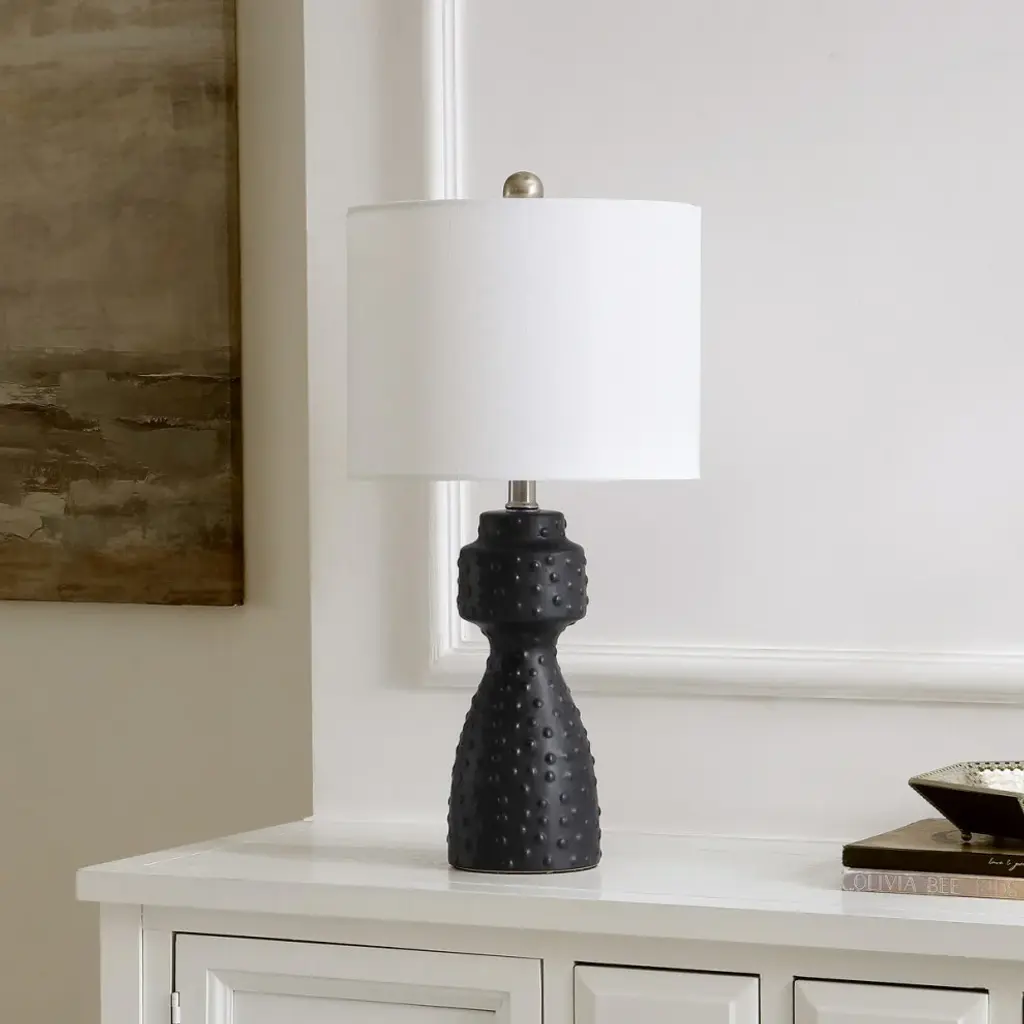 Liven up your decor with the stunning textures and charm of our Theory table lamp. Its sleek and sculptural silhouette is dotted with ceramic spheres to deliver fun and playful textures. Finished off with a black ceramic finish, the table lamp attains a sleek and chic presence. It adorns a white drum shade to filter soft and diffused light onto your tabletop. Our stunning table lamp can become an artful and eclectic focal point for your nightstand, console, or end table.