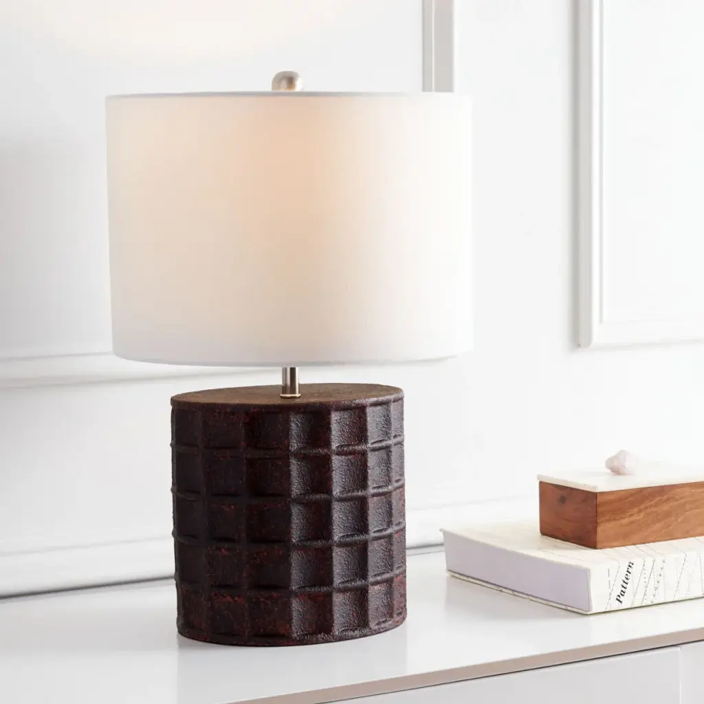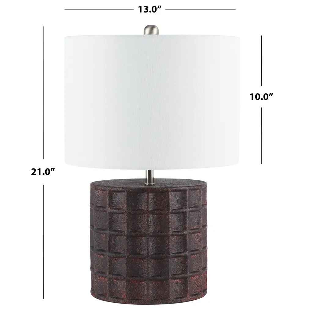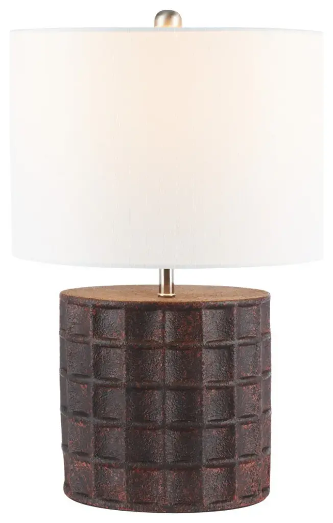 A grand decorative statement for today''s eclectic interiors, this Welsh Table Lamp hearkens back to ancient stone craft. A dark rust tone highlights its brilliantly textured design, and an off-white shade completes the look.Lamp Certified: ULType of bulb included: LED A19 9WNumber of bulb(s) included: 1Max Wattage :TYPE "A" 60W OR CFL 23W OR LED 12WLight Bulb Base Type: E26 Screw Terminal