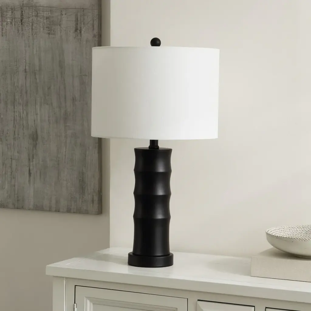 Bring modern elegance to any bare surface with our sleek and charming Zamora table lamp. A streamlined profile and eye-catching details make our table lamp a perfect match for your modern living. Its clean-lined pedestal is enlivened with a ridged detail for a subtle touch of drama. Completed with a black metallic finish and white drum shade, our table lamp remains a versatile and stylish addition to any room. It provides a soft ambient glow to elevate your nightstand, console, or end table.