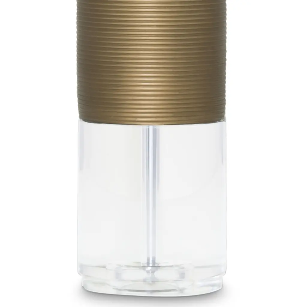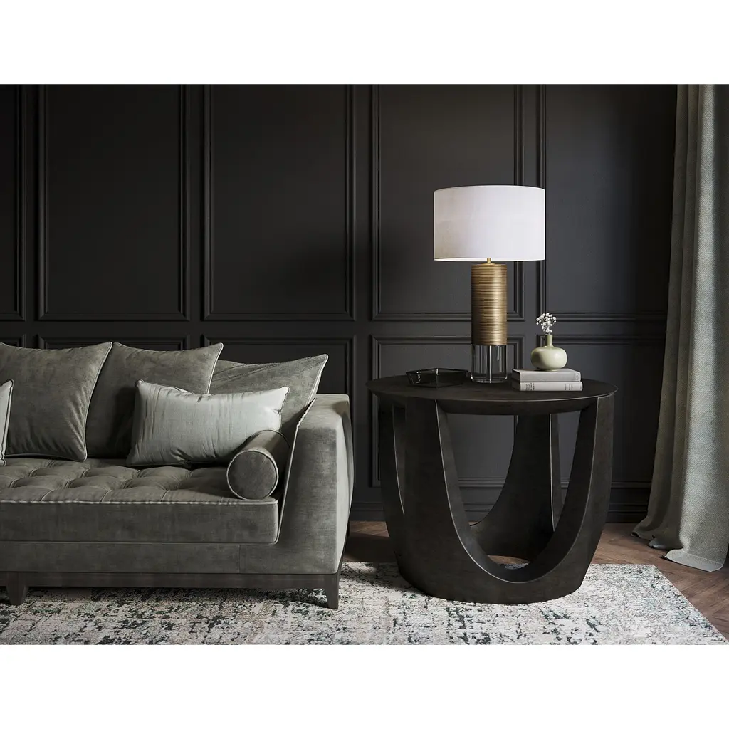 Contemporary meets antique in this stylish table lamp. Pairing a crystal column with a ribbed Antique Brass detail makes for a versatile piece of lighting perfect for modern, coastal or even transitional interiors. An Off-White linen drum shade completes the look. Available with a coordinating floor lamp. Also available in bronze, black, off-white and wood finishes.