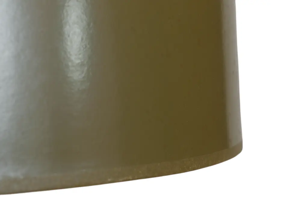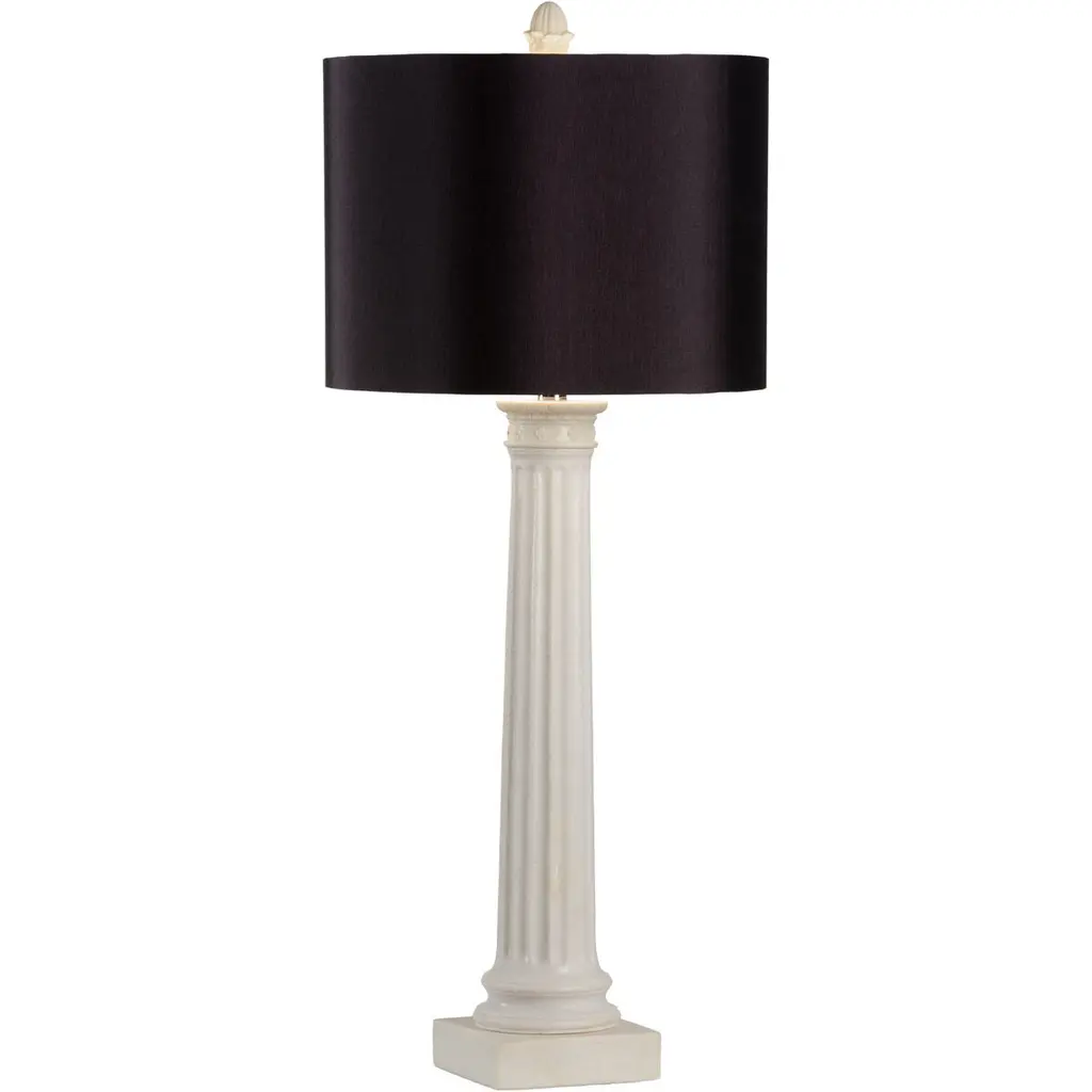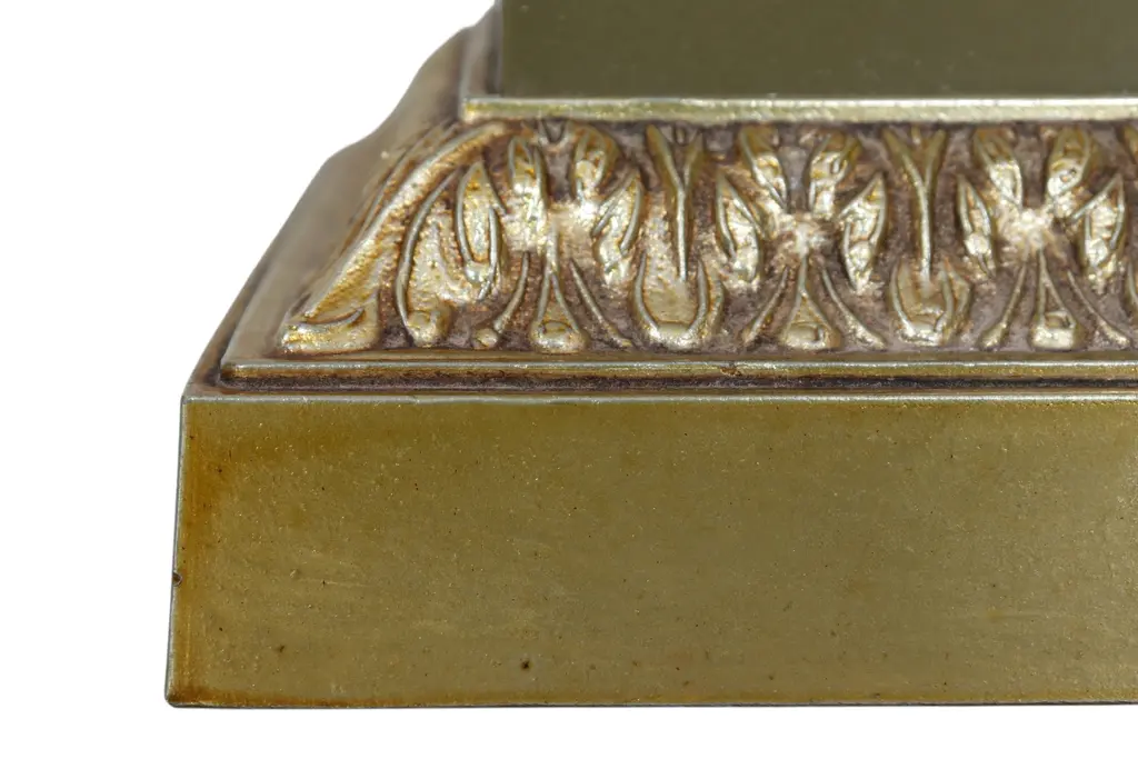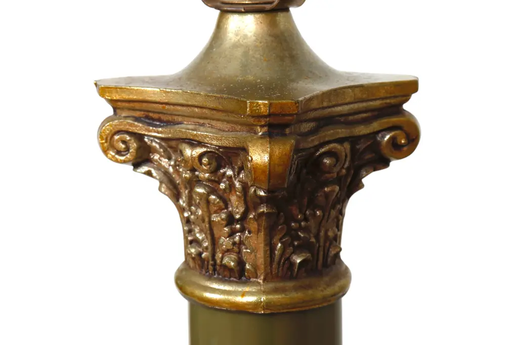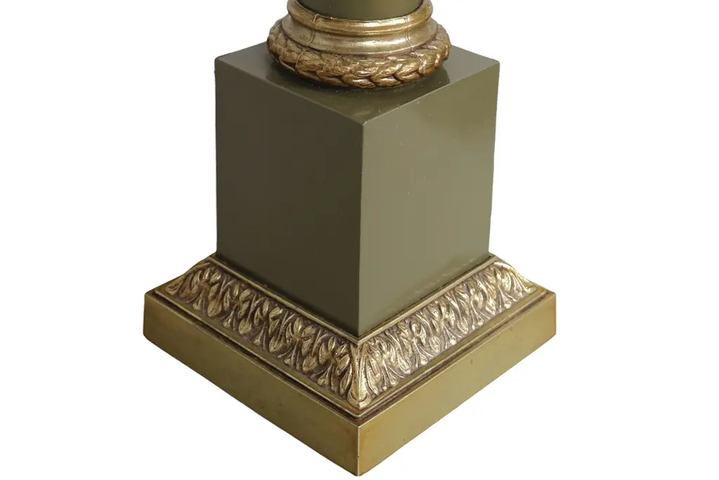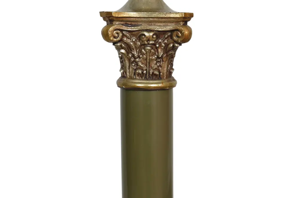 A French Empire style table lamp in sage green. A round central column is topped with an acanthus pressed brass capital beneath a matching sage green lampshade. The column sits above a squared block finished with a brass base. The harp is topped with an arrow shaped brass finial. Lamp measures 5.5"W x 5.5"D x 25"H to top of socket, 37.5"H to top of finial. Shade measures 16.75" in diameter.