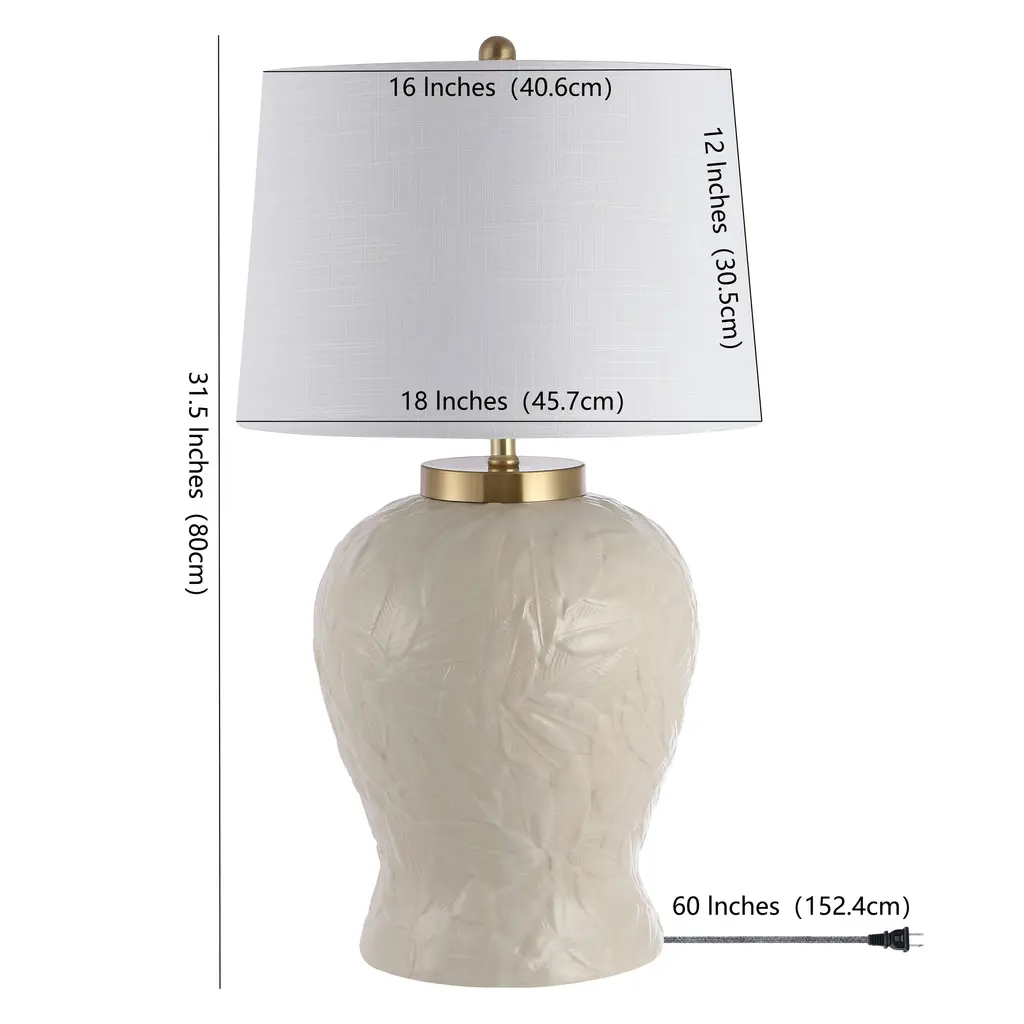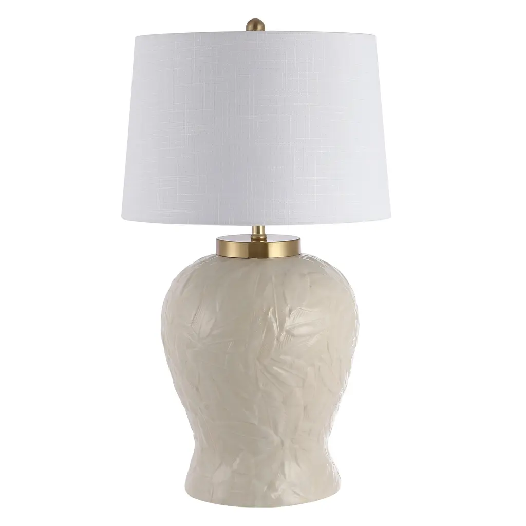 Our traditional ivory glazed lamp features a raised tropical leaf pattern. Two lamps would make the perfect pair for a bedroom, living room, or entry console. This traditional lamp's brass fittings add a glam Hollywood Regency touch to a cottage, coastal resort, or Bohemian interior. Includes an energy-saving dimmable LED bulb. Features:Dimensions:About us:You see a lamp.We see a decorative work of art.A perfectly curved shade casts a dramatic shadow on a floor. A silk cord you never want to hide. Compatible with LED lightbulbs: as easy on the environment as they are on the eyes. The JONATHAN Y Lighting collection considers every detail from impeccably sourced materials to designer styling. And our prices are so attractive, we've transformed a functional necessity into a fashion accessory.JONATHAN Y Lighting - a fashion revolution in home decor.