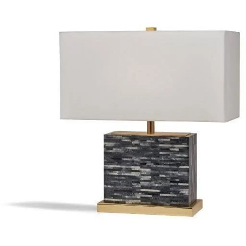 The Floating Rectangle Base Features A Rubbed Gray Faux Shagreen Texture, Surrounded By Polished Nickel Plated Details. The Rectangle Hardback Shade Is A Gray Linen Fabric.