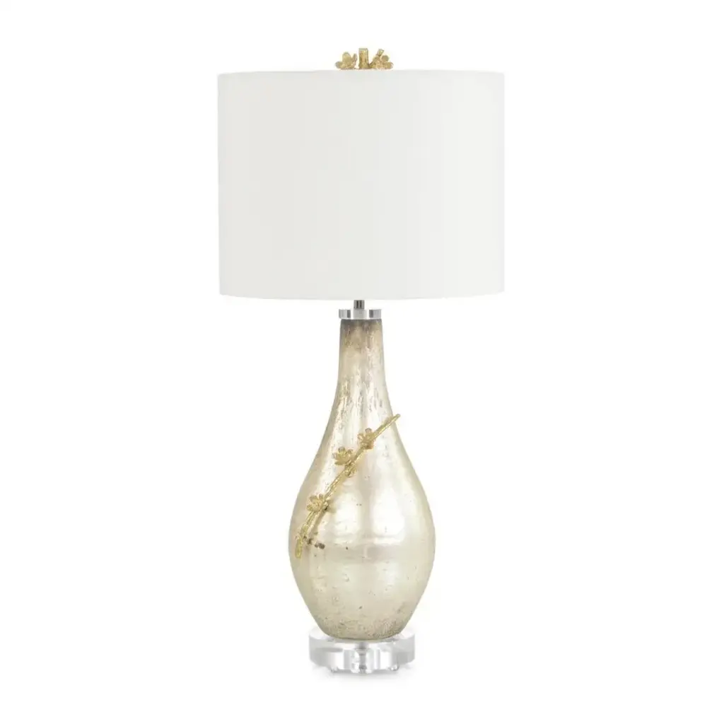The Sakura Table Lamp is a delicate piece featuring a teardrop shaped body of glass hand-finished in Antique Nickel. Running along the edge of the piece is a brass branch with budding flowers, a whimsical, natural element that is also reflected in the matching finial perched atop the lamp. Two circular discs of clear acrylic are located at the base and neck, imbuing the Sakura with a touch of modernity.