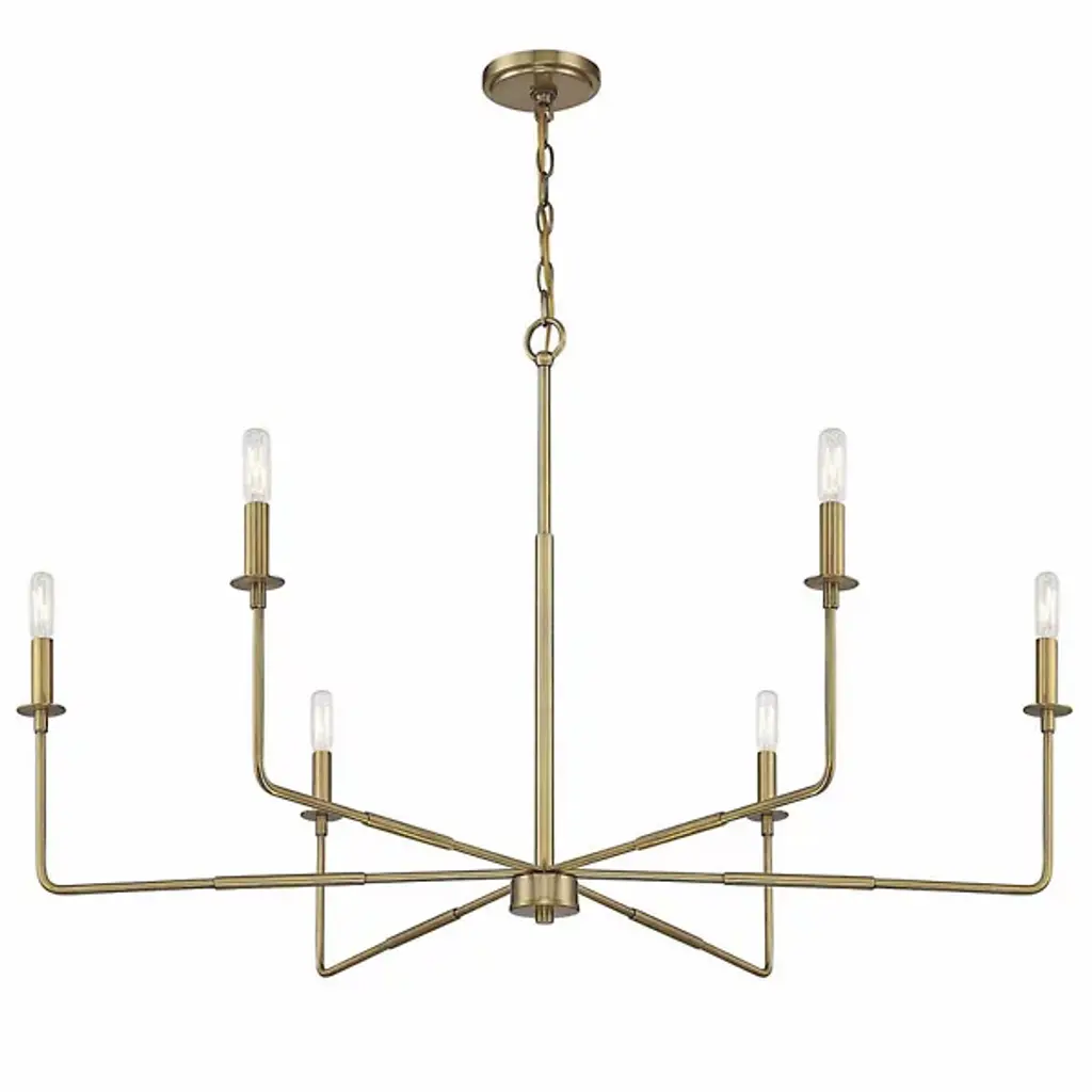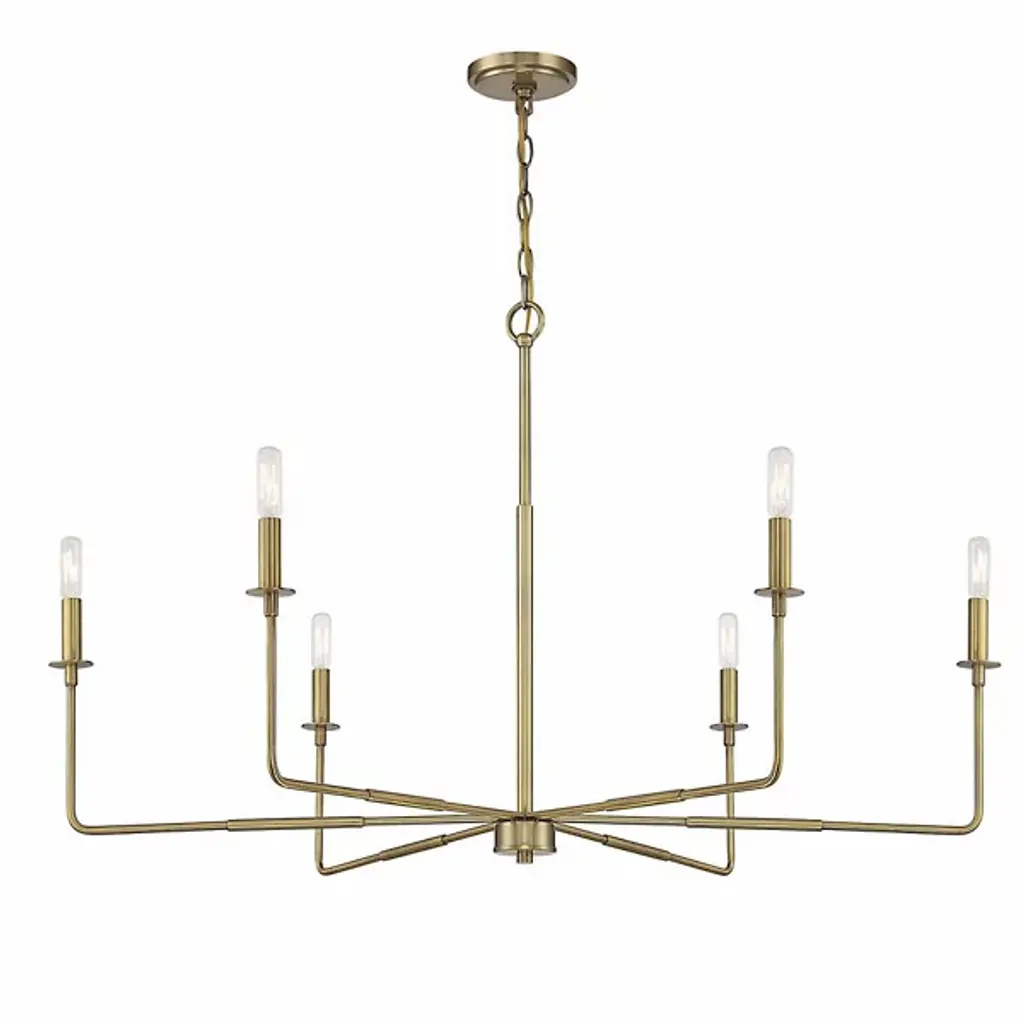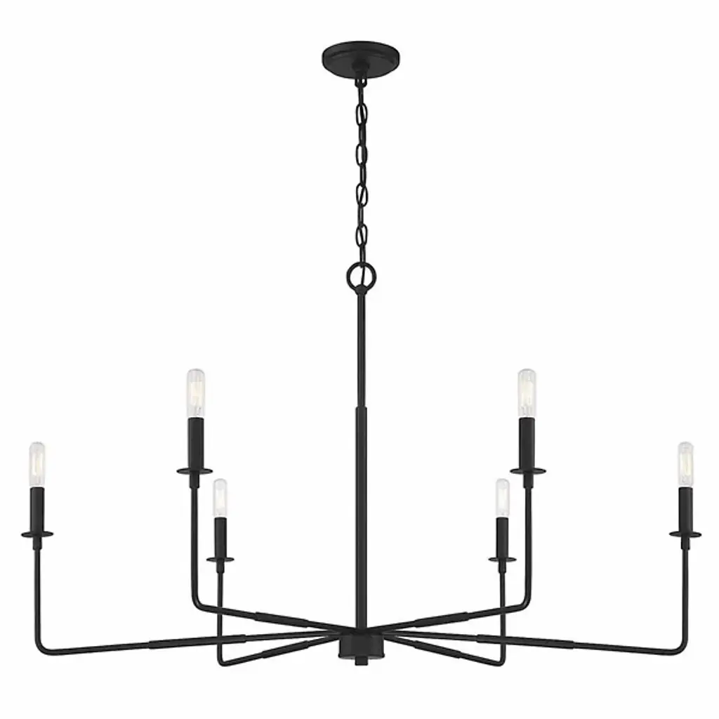 Expand indoor illumination with the wide-reaching and tasteful height of the Salerno Chandelier from Savoy House. A refined, simple design with plenty of reach and a rustic appeal, it descends via chain and stems from a stepped circular canopy, securing a round hub below that steadies several slender arms that arc out and then up. Each arm blooms a candelabra lamp from a small, circular bobeche, playing well with a vintage-style bulb to add an element of contrast to the fixture’s assured elegant simplicity.