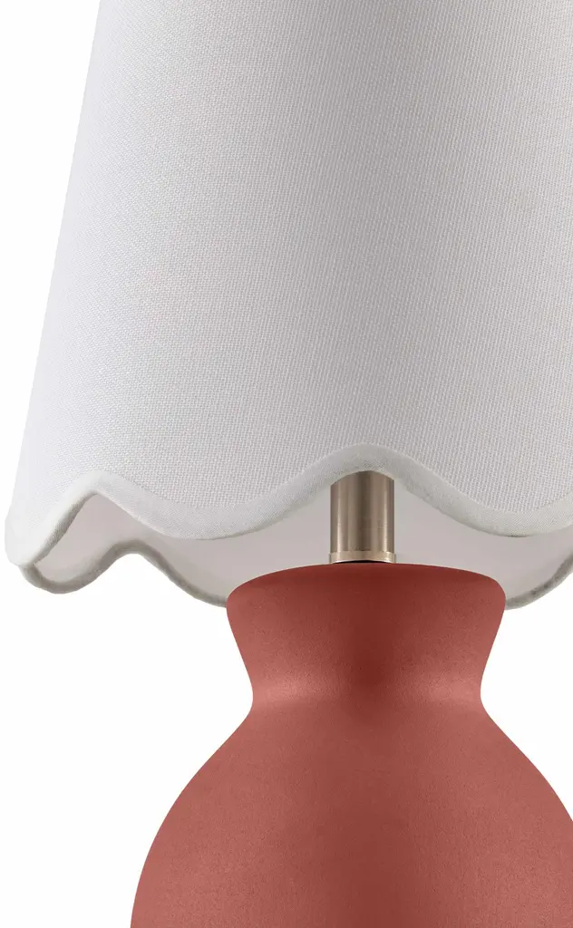 Collection: Salgareda Colors: Brick Red, White, Translucent Material: Body: Ceramic / Shade (Outside): Cotton / Shade (Inside): Polyurethane Styles: Transitional,Traditional Made In: China Lighting Type: Accent Table Lighting Shade Material: Cotton, Polyurethane Shade Color: White, White Cord Length: 6' Switch Type: Rocker Number of Bulbs: 1 Socket Type: E-26 Bulb Wattage: 40W