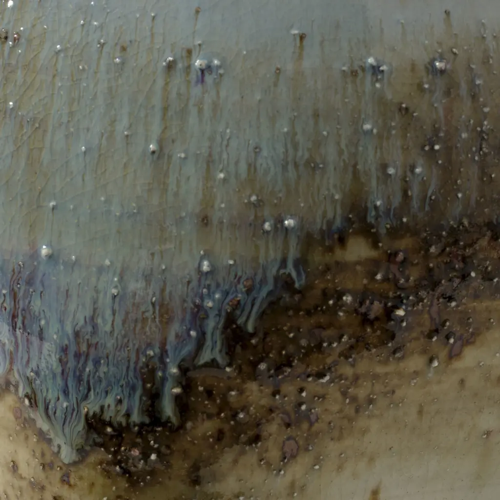 Multiple layers of reactive glaze are expertly applied by hand to the base of this stunning ceramic table lamp, utilizing blue, natural, and purple glazes to create a serene and slightly ethereal landscape. The round trapezoid finial and hardware are made of warm brass, and the drum shade is crafted from white linen. Fully artisan-crafted, each lamp is a work of art, and no two will be identical.