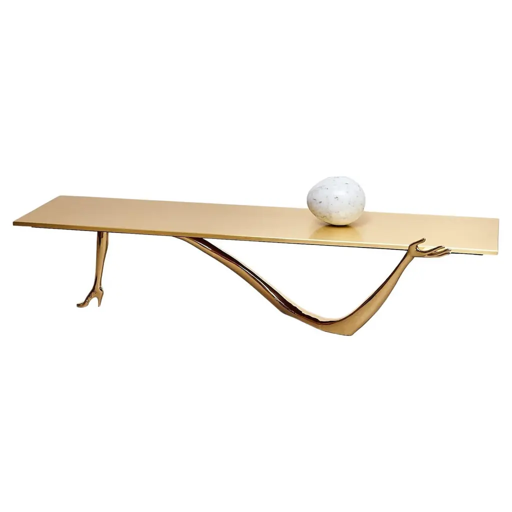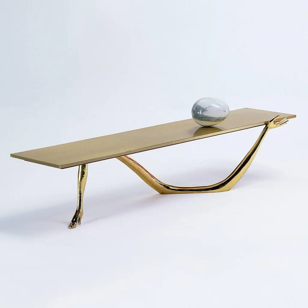 Leda low table designed by Dali manufactured by BD.Legs are in a cast varnish brass.Tabletop in brushed and varnished brass.Carrara marble egg on top.Measures: 51 x 190 x 61 H.cmDuring the ‘thirties in Paris, Salvador Dalí surrounded himself with a circle of friends involved in the application of art to varied disciplines, above and beyond the study of pure pictorial art. Jean-Michel Frank, a furniture maker and decorator of recognized prestige in the Paris of those years, was on very good terms with Dalí and together they worked on several ideas. The Bracelli lamp which we present here is a Classic design after Jean-Michel’s manner of designing and working, adopted by Dalí for his house at Portlligat. Amongst Dalí ’s specific furnishing projects, and constituting another for his curriculum vitae as a designer, may be counted the garden furnishings for his Portlligat house, the complete architecture of the Night Club (garotte-shaped) for the Hotel Presidente in Acapulco (1957) and another project for a bar in California in the ‘forties. As shown by the small selection now produced and included in this catalogue, Dalí ’s work was not restrictes to the traditional furnishing elements, but included tap fittings, handles, door-pulls, printed fabrics and objets of indeterminate use. In the 1990s a group of experts, led by Oscar Tusquets, set themselves the task of turning the furniture Dalí had drawn for Jean-Michel Frank into reality. Amongst these items were the Leda chair and low table, taken from the painting “Femme à la tête rose” (1935).Each exquisite piece is meticulously handcrafted by skilled artisans, infusing it with a sense of individuality and artistry. The process of creating each item ensures that no two pieces are exactly alike, as subtle variations and unique characteristics emerge through the artisan's touch. These distinctive qualities may manifest as slight differences in texture, small scratches, or variations in the brass finish, serving as a testament to the authentic craftsmanship and the human element invested in every creation. Furthermore, as part of the inherent charm of these handcrafted pieces, some variations might present themselves as occasional stains or slight tone differences on the surface, adding to the allure of their uniqueness. Embracing these variations, our handcrafted pieces must be considered sculptures, each one telling a story of the artisan's dedication and evoking a sense of timeless elegance that cannot be replicated by mass-produced alternatives. These nuances celebrate the organic nature of the crafting process and contribute to the character and soul of every item, elevating it from mere decor to a cherished masterpiece in its own right.