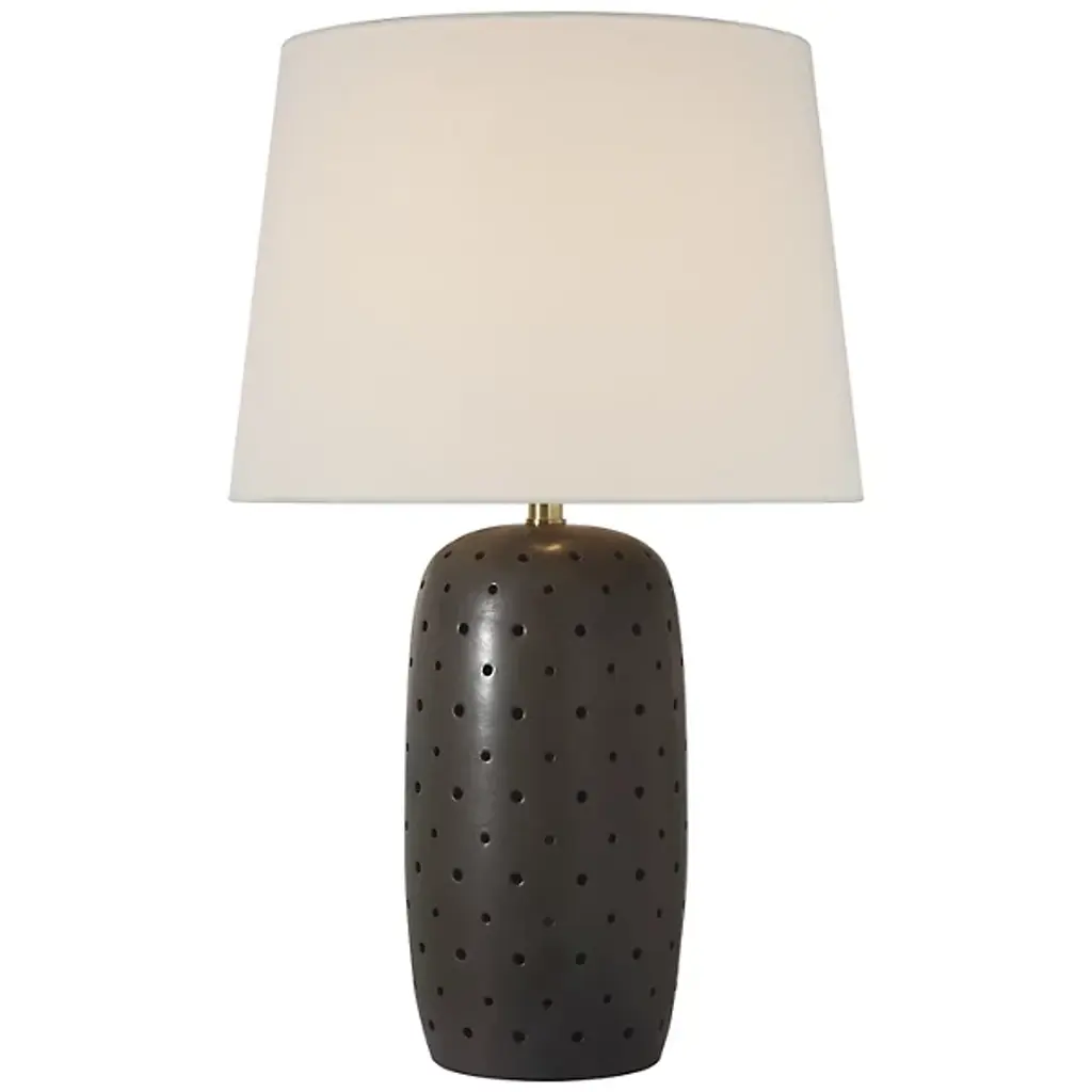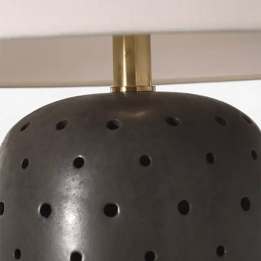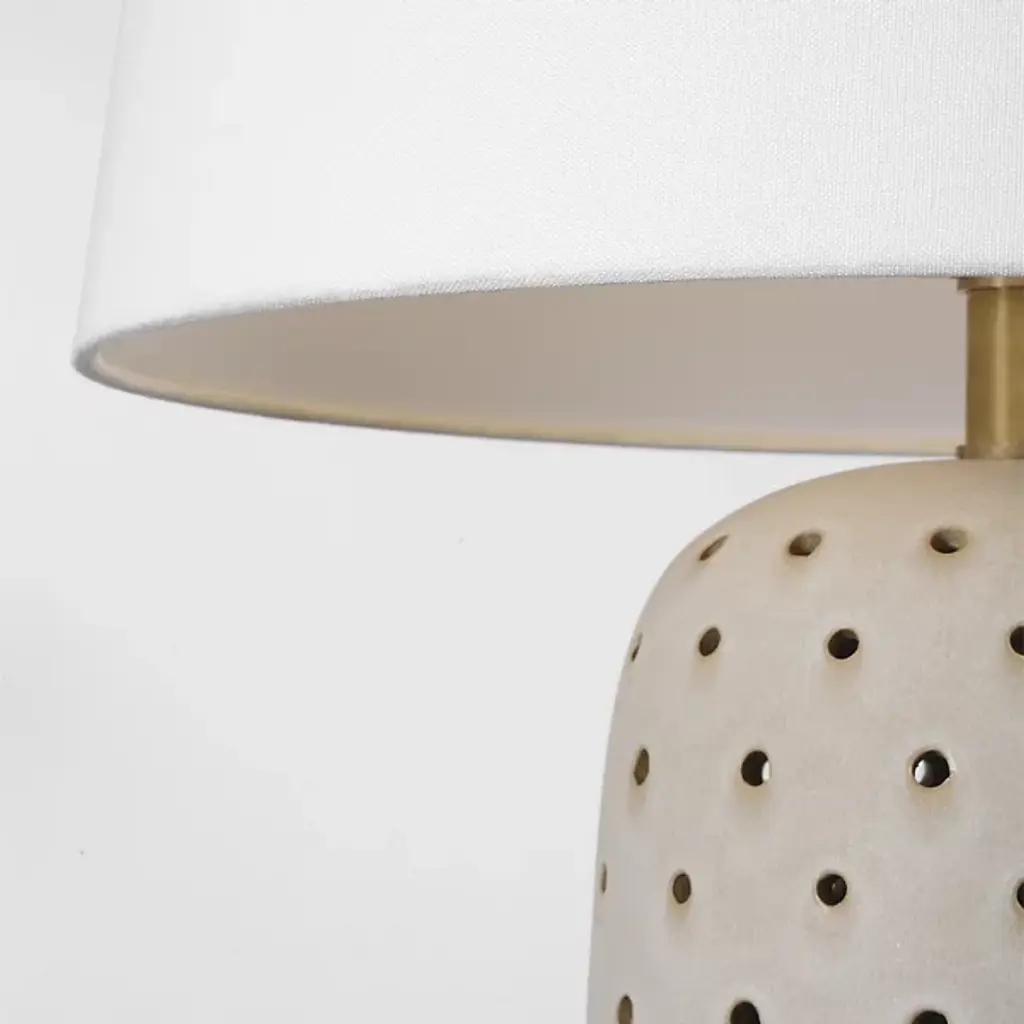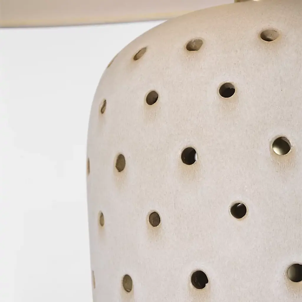 The Samara Table Lamp from Visual Comfort Signature features a perforated surface that allows light to escape through precise openings, creating a constellation effect in darkened rooms. Chapman & Myers embrace the ceramic medium's potential for both structure and decoration in this casual design. The brass base anchors the piece while complementing the ceramic body. When illuminated, light projects upward through the shade. This lamp excels in intimate settings like bedrooms or reading nooks where its ambient yet direct lighting effects can elevate the atmosphere.