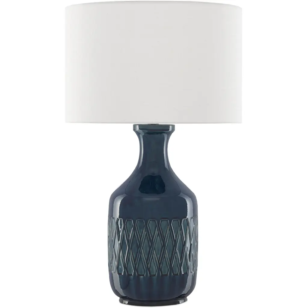 Our Samba Blue Table Lamp is luminous with its ocean blue reactive glaze covering the ceramic surface of the vase-shaped body. The pattern that has been carved into the ceramic at the lamp’s widest point absorbed the glaze differently, which gives this lamp an uptick in personality. The off-white shantung shade is fastened to the blue lamp by a matching finial. We also offer the Samba in white.