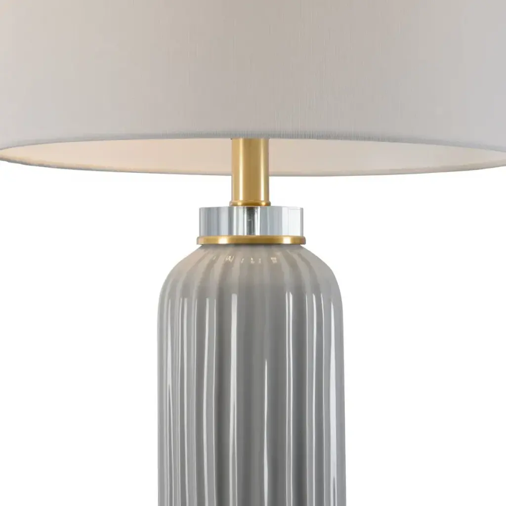 WHETHER AT HOME OR IN THE OFFICE, SAMUEL CERAMIC LAMP IS A CONTEMPORARY LOOK THAT CAN TRANSFORM YOUR ROOM. THIS 30" TABLE LAMP IS CRAFTED OF GRAY GLAZED FLUTED CERAMIC. THE SMOOTH CURVES OF THE CERAMIC CONTRAST WITH THE STRAIGHT LINES OF THE CLEAR CRYSTAL BASE WHILE THE WARM BRASS ACCENTS PULL THE DESIGN TOGETHER. IT IS TOPPED WITH A CLASSIC OFF WHITE LINEN DRUM SHADE TO DIFFUSE LIGHT THROUGHOUT YOUR SPACE.