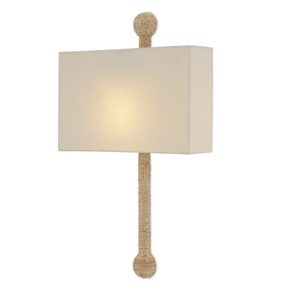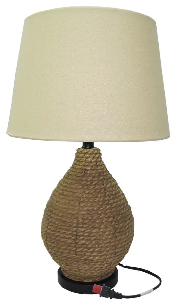 Product Details 27" high. Bottom pedestal of base is 5 1/2" wide x 1" high. Shade is 14" across the top x 16" across the bottom x 10" high. Weighs 4.18 lbs. Uses one maximum 150 watt standard-medium base Type-A light bulb (not included). On-off socket switch. Natural wicker twine on a metal base frame. An open, modern look. Black finish pedestal accent at the very bottom of the lamp. Light oatmeal color fabric lamp shade. 8-foot long brown cord with a brown plug.