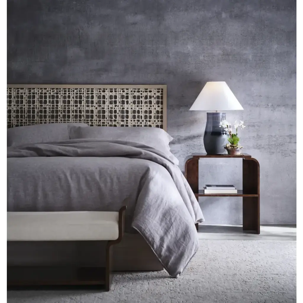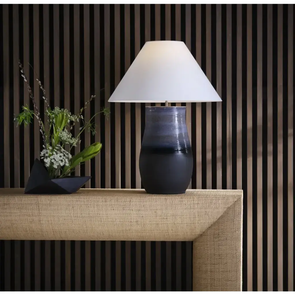 The Sana Table Lamp, part of the Shiga collection, is hand turned and finished in one of six ancient kilns in Japan. This classic modern jar lamp features a blue ombre glaze and is completed with cloth wiring and topped with a refined rolled-edge linen shade. Made in Japan.