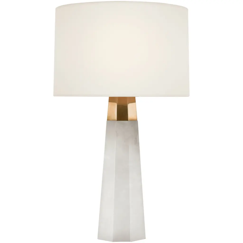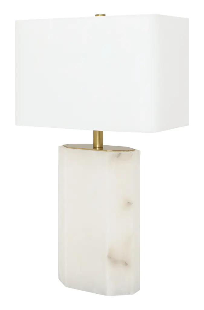 Our sophisticated Sanctum Lamp fuses natural beauty with a sleek, geometric shape for a table lamp that looks good wherever it goes. Chic and modern, Sanctum features a slim, octagonal base crafted from gorgeous white alabaster stone with subtle touches of natural veining. It’s paired with a rectangular white linen shade and bright brass details for a hint of shine. Earthy yet elegant, Sanctum is the perfect way to add an organic touch to an end table or nightstand. •natural alabaster stone•white linen shade •brass details•inline on/off switch•requires 60W max/type B candelabra bulb Dimensions •12"W x 7"D x 20"•base: 6.5"W x 3.75"D x 10.25"H•shade: 12"W x 7"D x 8"H