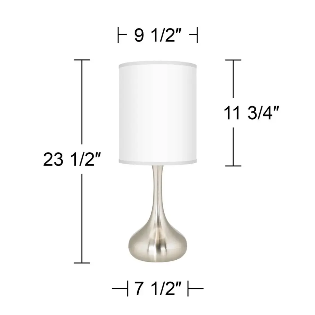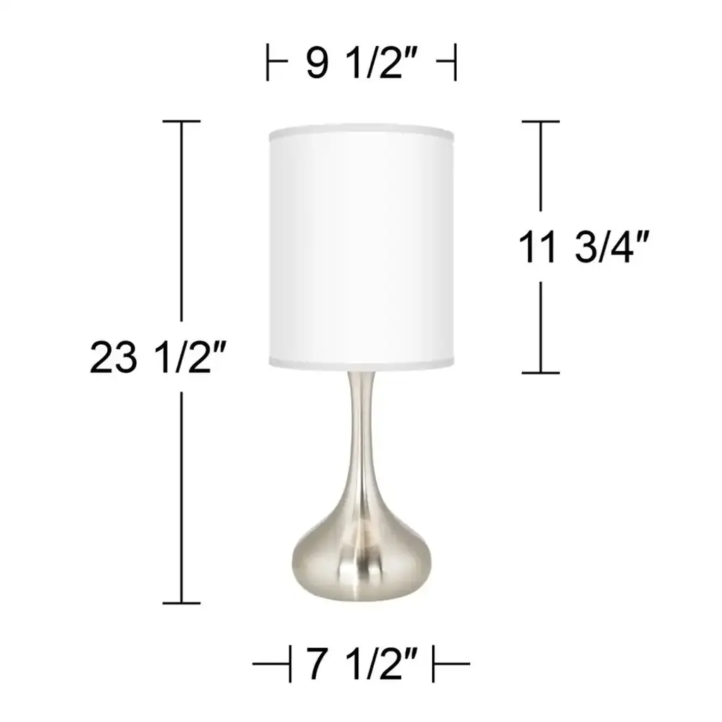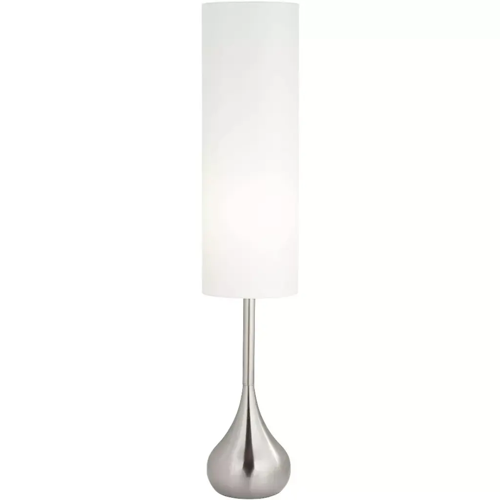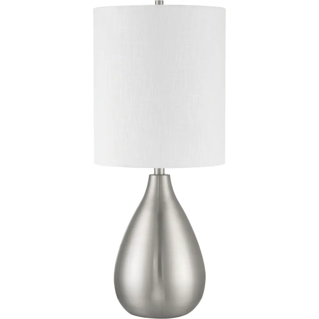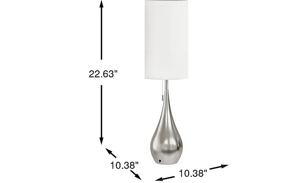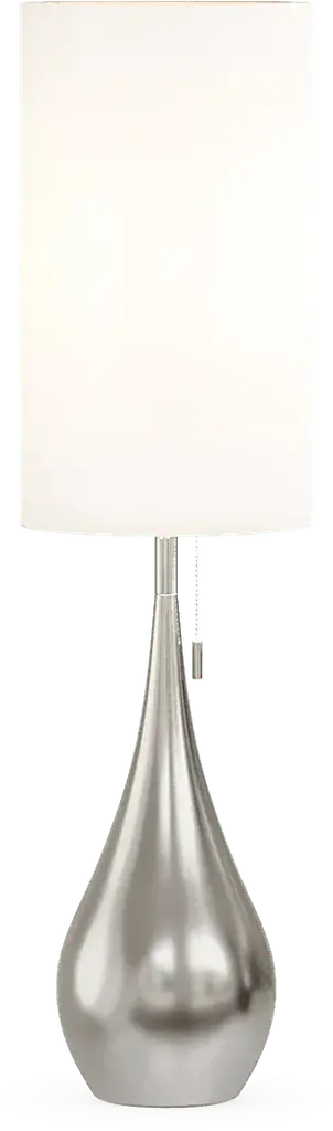 Bring sleek, contemporary lighting to any space with the Sanda Christina lamp. The table lamp's base features a tear-drop design in a chrome-inspired, silver finish. A white, elongated cylinder drum shade provides additional modern appeal while the light pull offers a hint of classic elegance. This lamp takes light bulbs up to 60 watts.