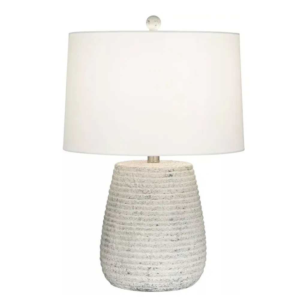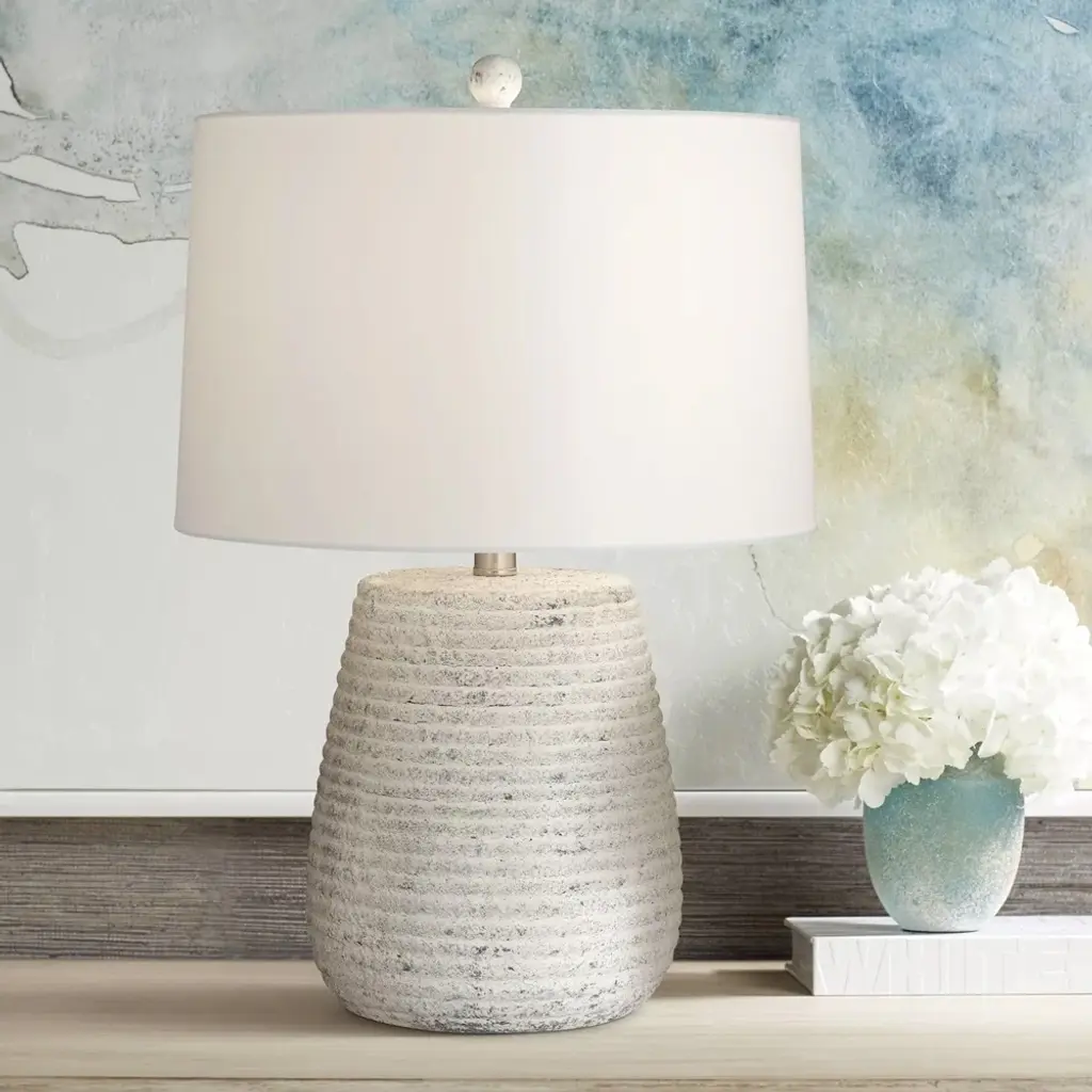 PRODUCT DETAILS: 23" high overall. Shade is 14" wide across the top x 15" wide across the bottom x 9 1/2" high. Uses one maximum 150 watt standard-medium base bulb (not included). On-off socket switch. Modern ceramic table lamp by 360 Lighting. Handcrafted ceramic base. Ideal for modern, Mid-Century, coastal, or rustic style rooms. Sandstone rock finish. Ceramic construction. Due to the handcrafted design, the color and finish may vary. White linen fabric lamp shade. 8-foot long cord.