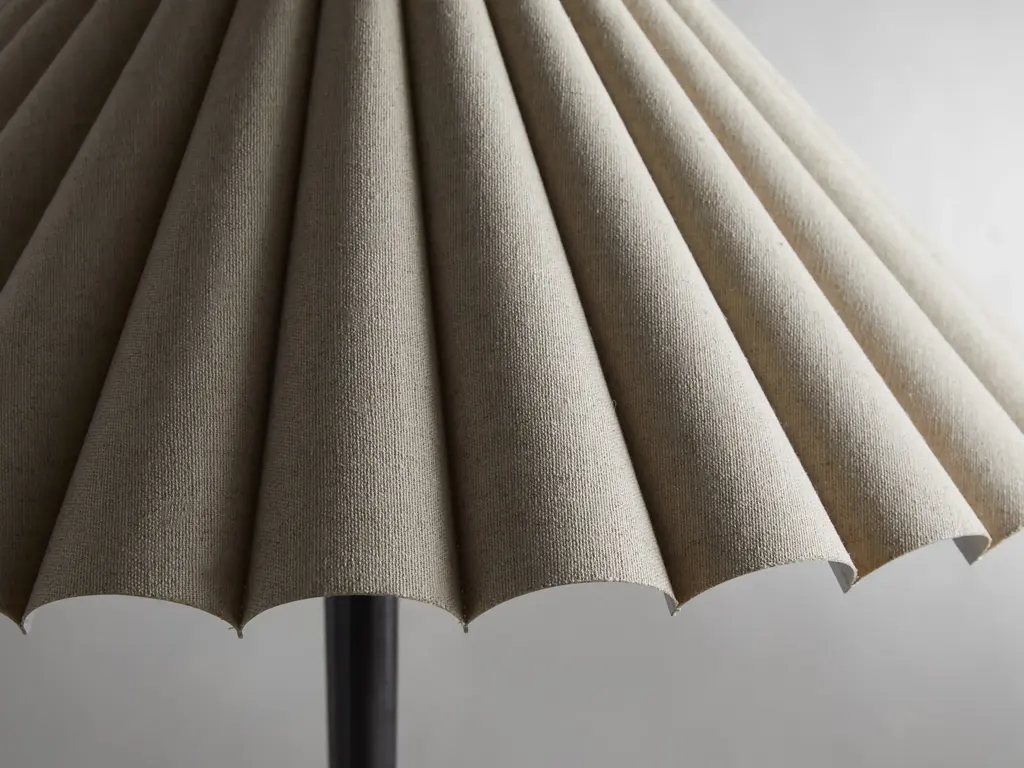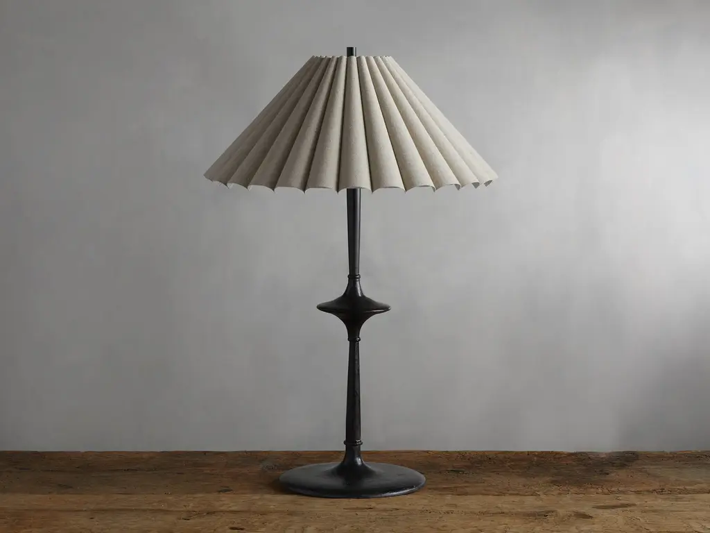 Fill your space with warm, softly diffused light with our Santiago Table Lamp. Featuring a cast iron base with a subtle textured surface, this lamp is complemented by a natural linen shade that is beautifully pleated and tapered.