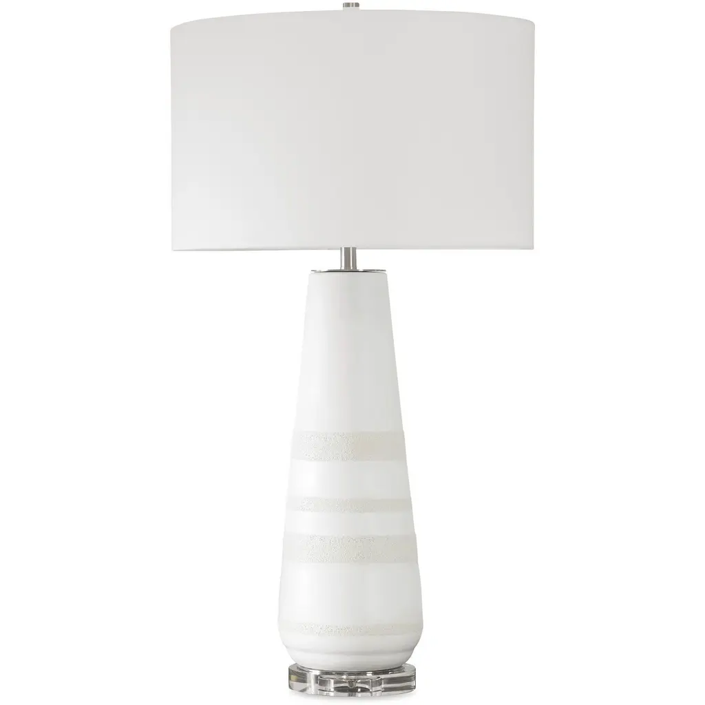 Showcasing A Crackled Ivory Ceramic Base With Heavily Textured Dove Gray Bands For A Touch Of Earthy Elegance. Resting On A Thick Crystal Foot And Accented With Brushed Plated Nickel Finishes, This Lamp Brings A Serene Sophistication To Any Room. The Round Drum Shade Is Covered In A Crisp White Linen Fabric. Due To The Nature Of Fired Glazes On Ceramic Lamps, Finishes Will Vary Slightly.