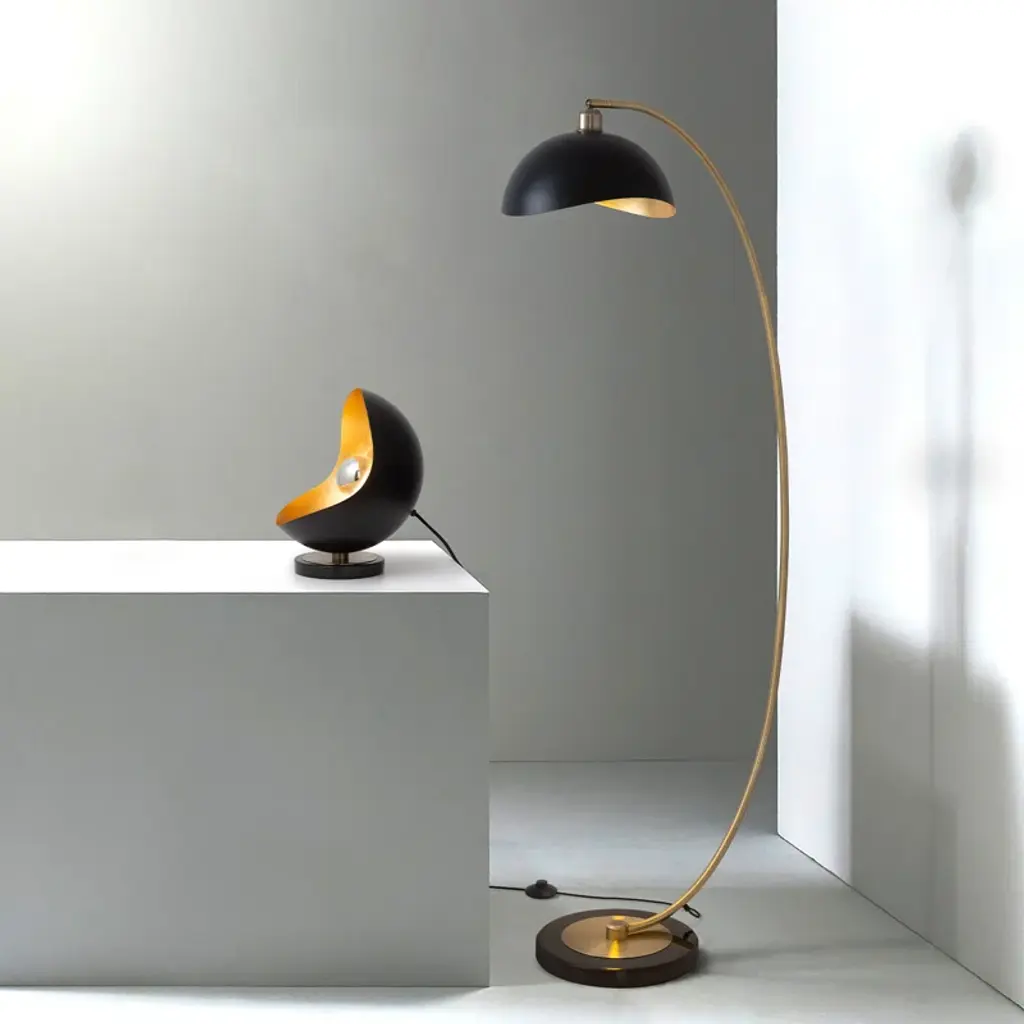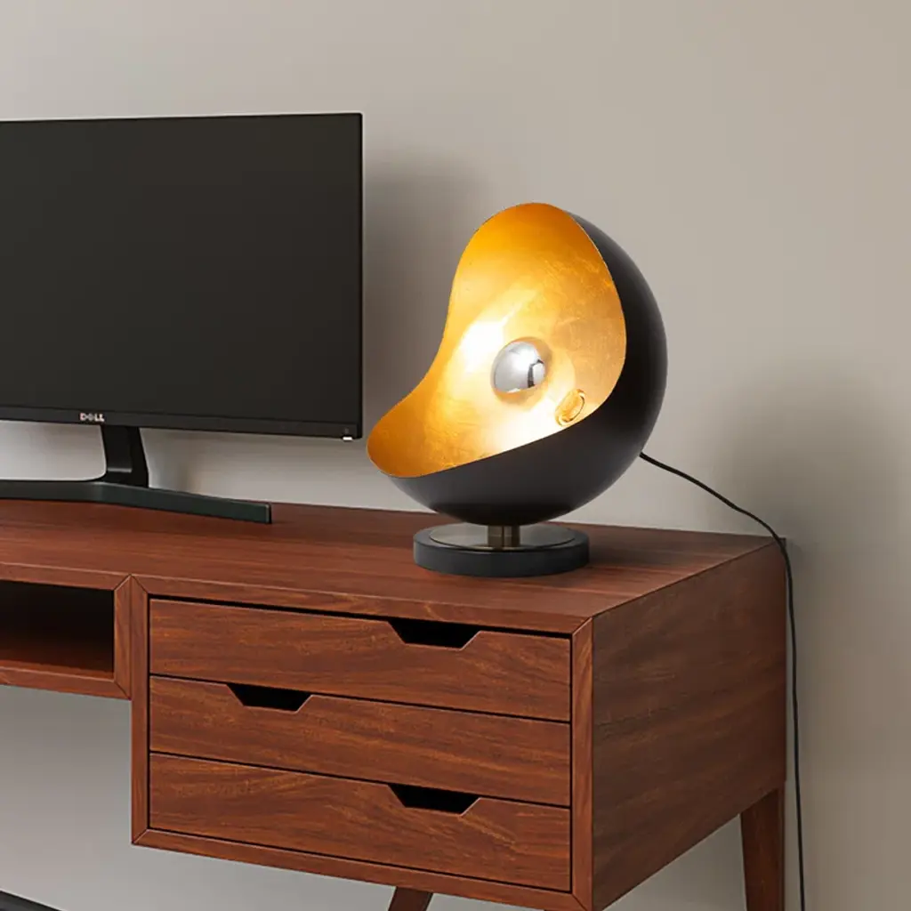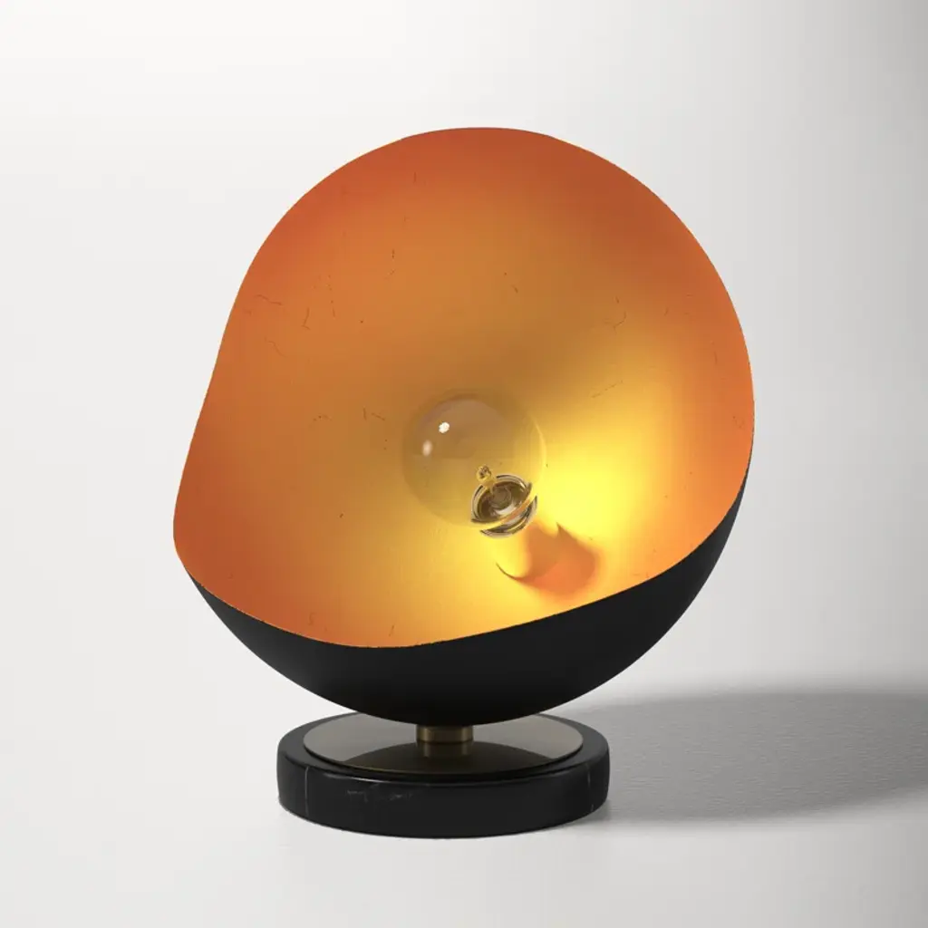 Our sculptural lamp was inspired by a mid-century modern design manufacturer created created in the 1960s. The glamorous and sculpted silhouette adds a romantic feeling to any side table, desk or nightstand. Place it on a desk or windowsill as an accent piece. The black sculptural shade with a hand-applied gold leaf finish and will create an elegant statement. The silver-tipped bulb is included and adds a mid-century appeal. Switch it on to fill the room with light or dim it down to set a calming mood.