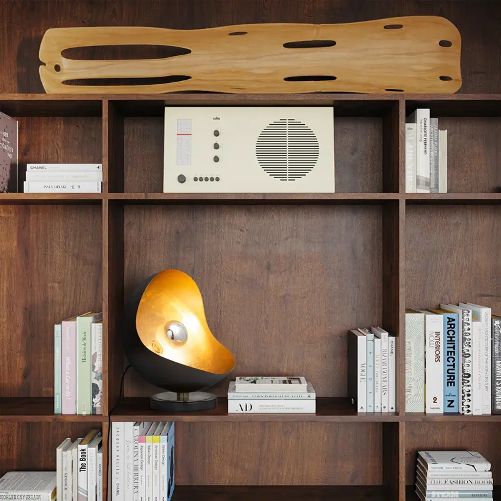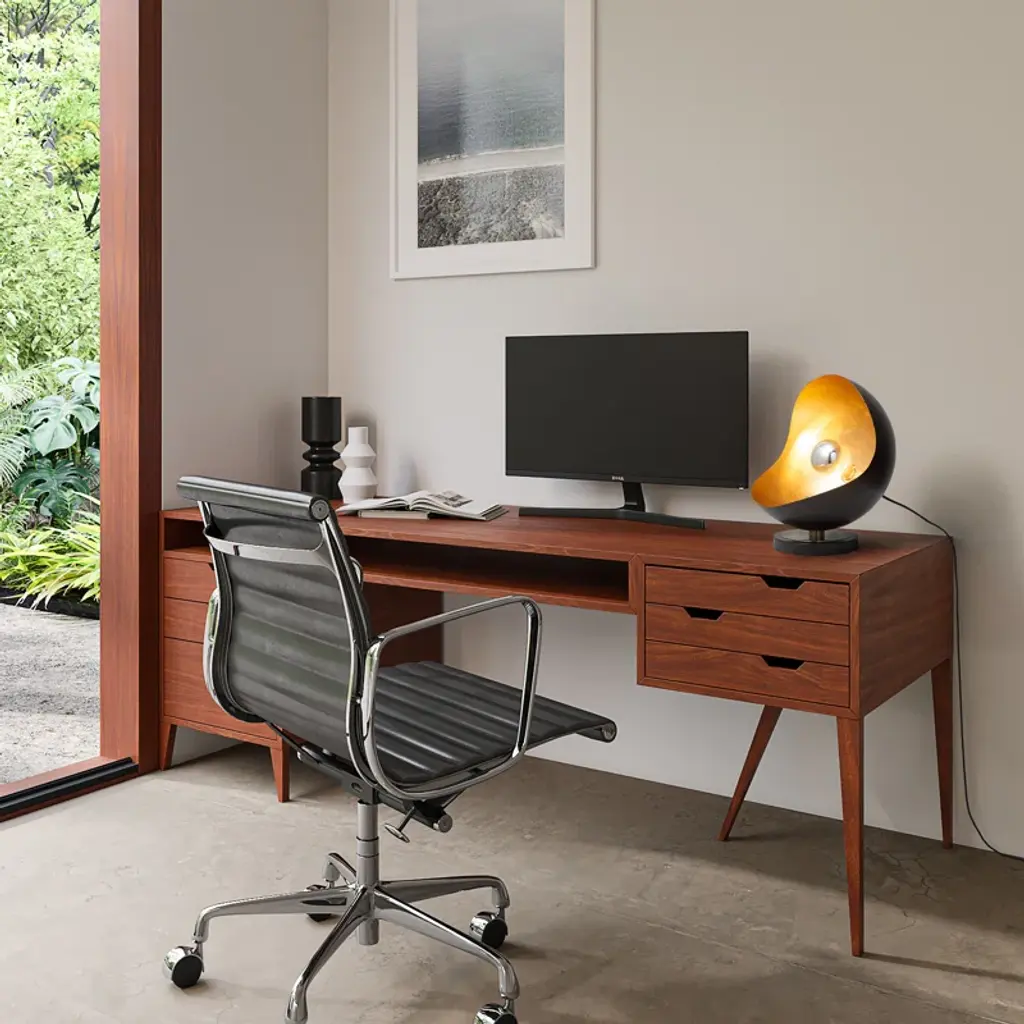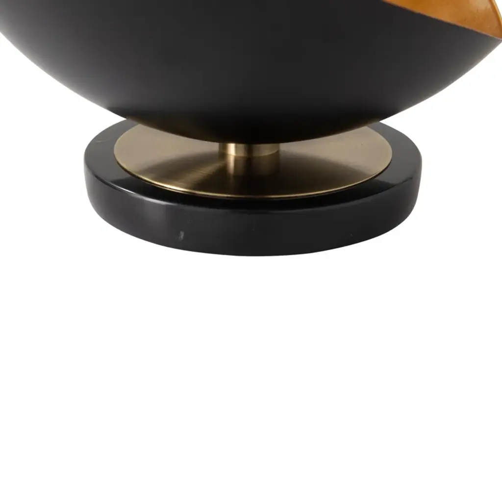 Our sculptural lamp was inspired by a mid-century modern design manufacturer created created in the 1960s. The glamorous and sculpted silhouette adds a romantic feeling to any side table, desk or nightstand. Place it on a desk or windowsill as an accent piece. The black sculptural shade with a hand-applied gold leaf finish and will create an elegant statement. The silver-tipped bulb is included and adds a mid-century appeal. Switch it on to fill the room with light or dim it down to set a calming mood.