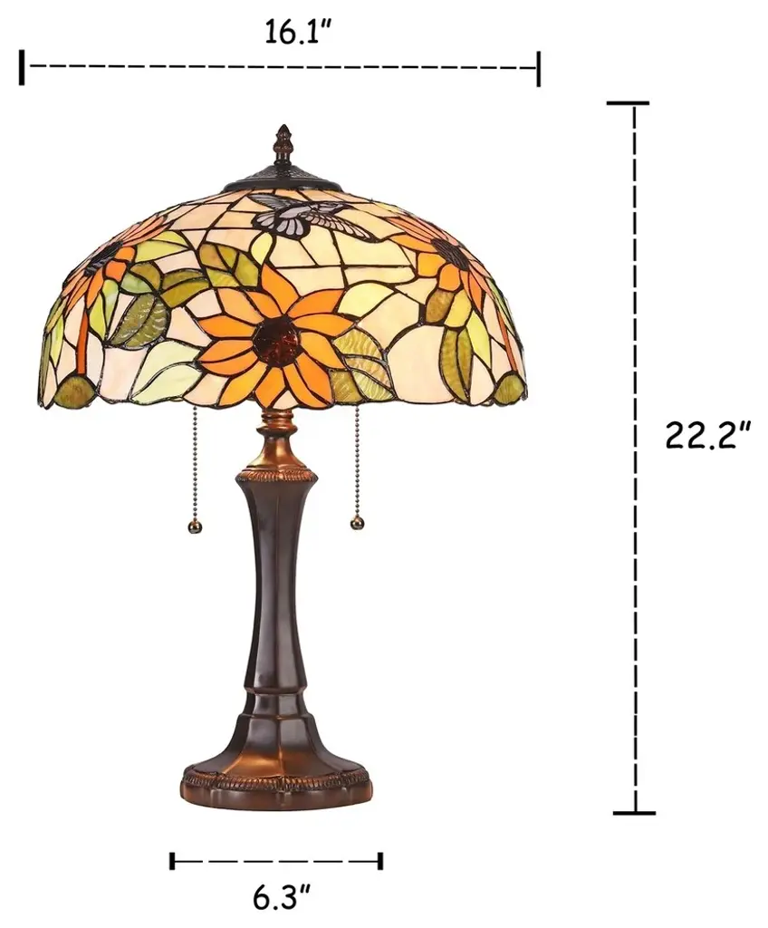 Sarai, a Floral style 2 light table lamp features a delicate set of bright sunflowers, and light green leaves over a peach back ground. This piece is hand crafted from over 260 pieces of art glass. Handcrafted using the same techniques that were developed by Louis Comfort Tiffany in the early 1900s, this beautiful Tiffany-style piece contains hand-cut pieces of stained glass, each wrapped in fine copper foil.(2) 100 Watt E26 Type A Bulb (not included)Plug-in261 pieces glass cutDownlightIndoor SettingSince these are hand crafted products, the exact color of glass pieces may vary. Colors of the glass will appear darker and less vibrant when not illuminated. Handmade glass will vary from one piece to the other; glass made at different times will also vary. Light bulbs used in lamps or ambient lighting may affect the appearance of the products. Stained glass product has been protected with mineral oil as part of the finishing process. Please use a soft dry cloth to remove any excess oil.