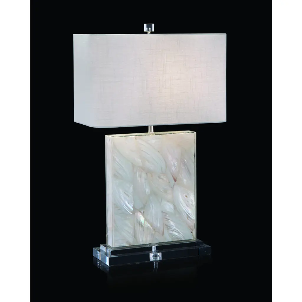 29"H This table lamp is a must-have piece for a beachy abode. It is designed with an acrylic panel inlaid with a glossy natural seashell. It is finished with a linen shade and a tiered acrylic pedestal base. Shade: (17" X 9") X (17" X 9") X 10", Whit