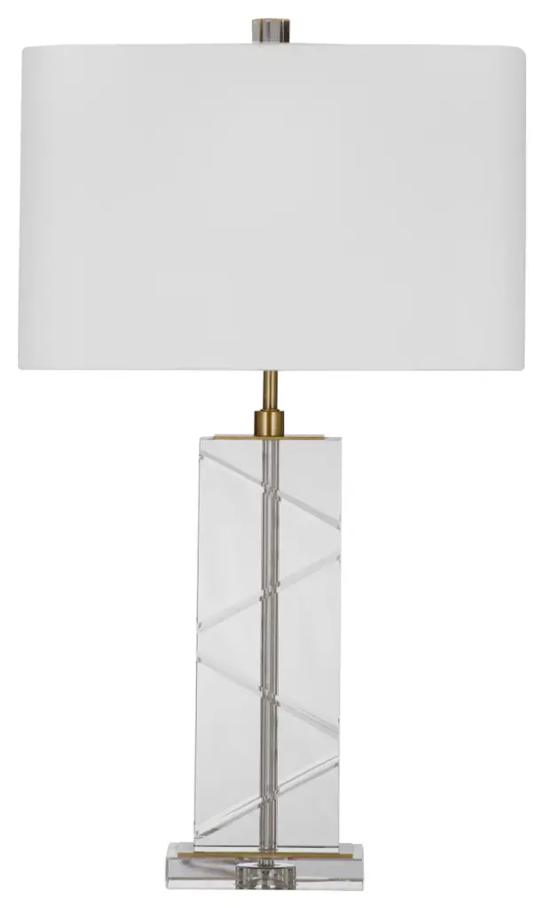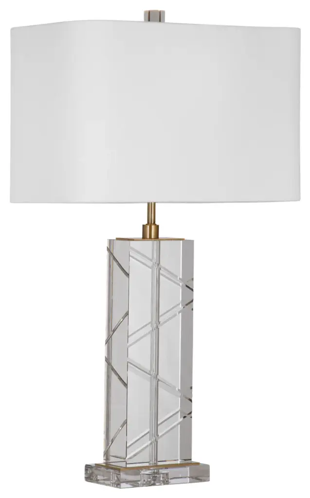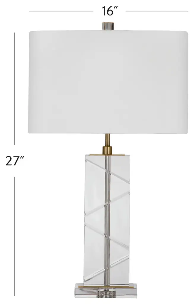 The Sahi Table Lamp is crafted of clear cut crystal with a white rectangular shade.Features:This table lamp boasts a luxurious, glam style.The rectangular shaped lamp shade features a white finish.Features a 3 way switch.Bulb type a required, not includedEasy assembly - just attach harp, finial and shade.For over a century, Bassett Mirror has been synonymous with style and quality, transforming homes with its sophisticated and timeless designs. With a wide-ranging collection of furniture, lighting, mirrors, and art, Bassett Mirror seamlessly blends modern style with classic appeal. From rustic modern to luxe glam, each piece is thoughtfully crafted to inspire and elevate any space. Committed to exceptional value and customer care, Bassett Mirror makes it easy for homeowners to create beautiful, personalized interiors with confidence.