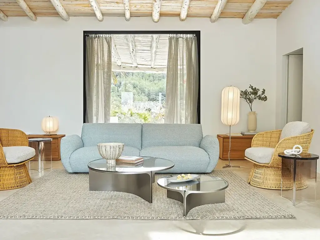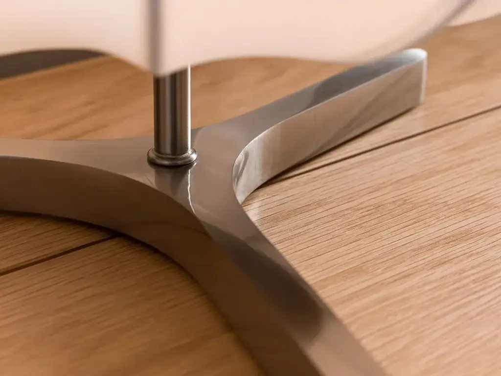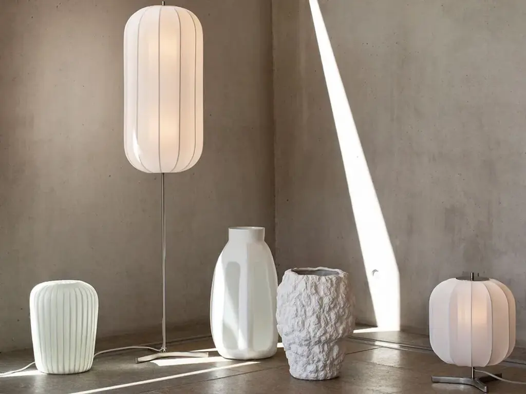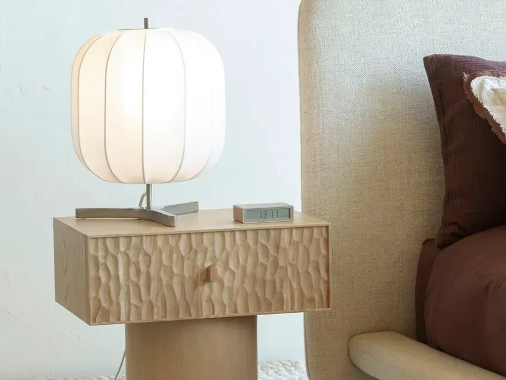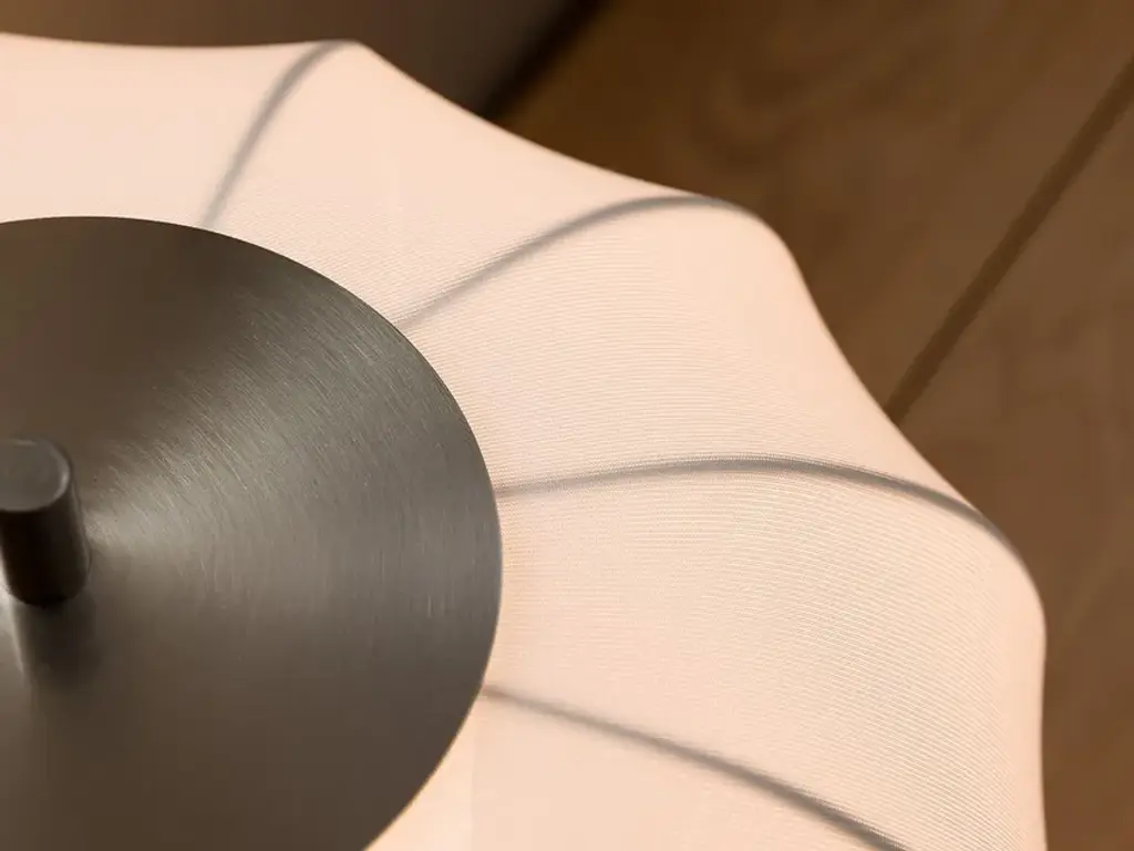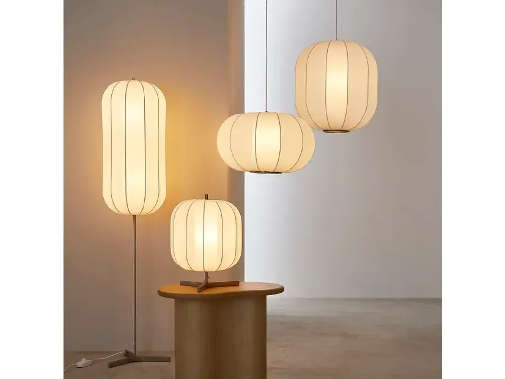 Inspired by traditional Japanese lanterns, SATCHI is a contemporary lamp with soft, delicate lines. The lampshade, all in the round, lets light diffuse through its finely grooved light fabric.Description:Lampshade fabric 84% polyamide, 16% spandexPVC inner diffuserSatin nickel finish iron legFabric-covered electrical cord (polypropylene)Dimmable switchHolder for E14 bulbFor bulb (not included): 4W max compatible with dimmer switch