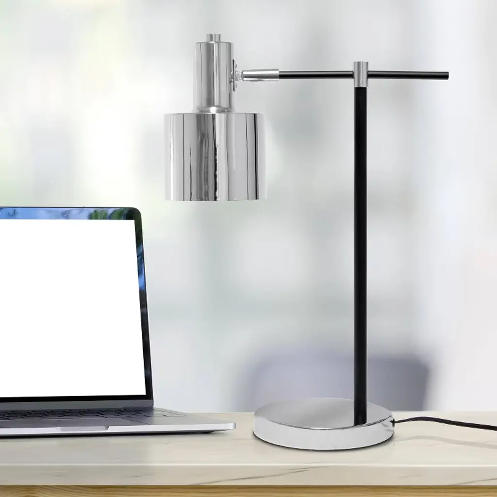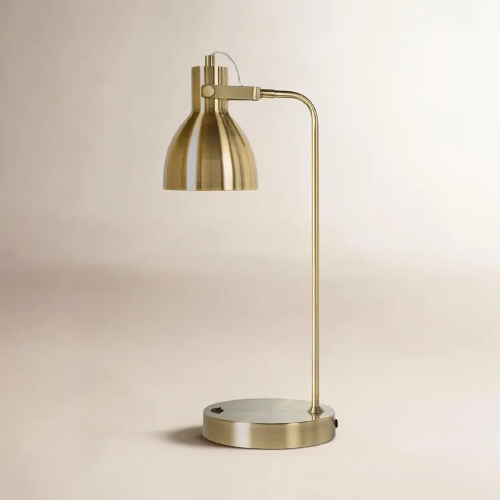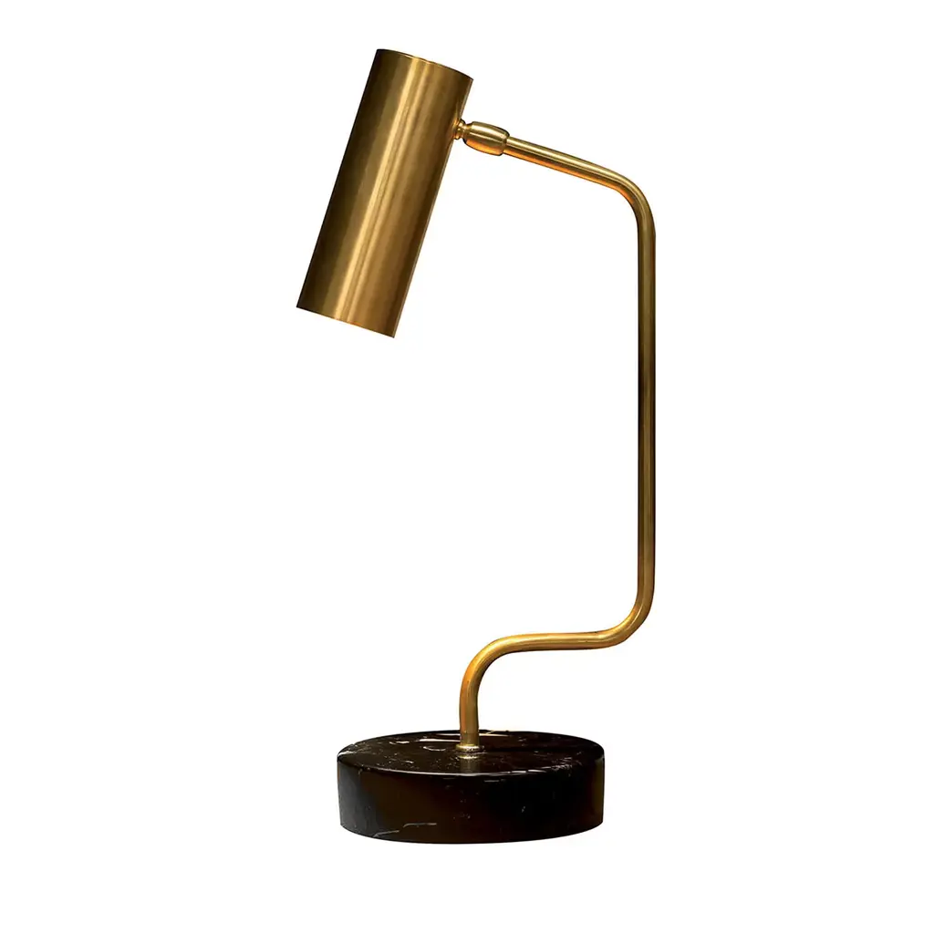 Modern table lamp of the Satellite Collection. The cylindrical lamp shade gives this item a vintage furniture appeal reminiscent of the technical industrial lamps of the 50s. The base, tube and joints are in naural brass, while the shade is in aluminum, black outside and in gold leaf inside.