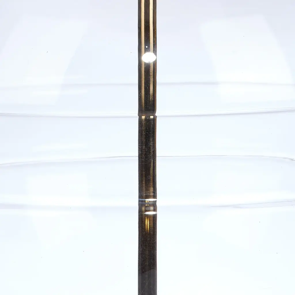Metal and glass combine to create a table lamp that is both bold and delicate, from its antique brass base to its matching finial. The clear spherical glass surrounding the iron axis of the lamp is like a celestial body in orbit. This table lamp is both simple and sophisticated and finds itself at home on a console, living room table, dining buffet, or anywhere else that needs a touch of uniquely elegant decor.